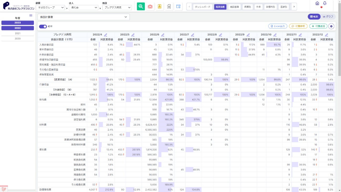 電子カルテや医事会計、リハビリシステムとの連携により、入院基本料ごとの施設基準管理や病棟別・診療科別の予算実績管理を自動化し、病院経営会議のDX化を強力に推進します。