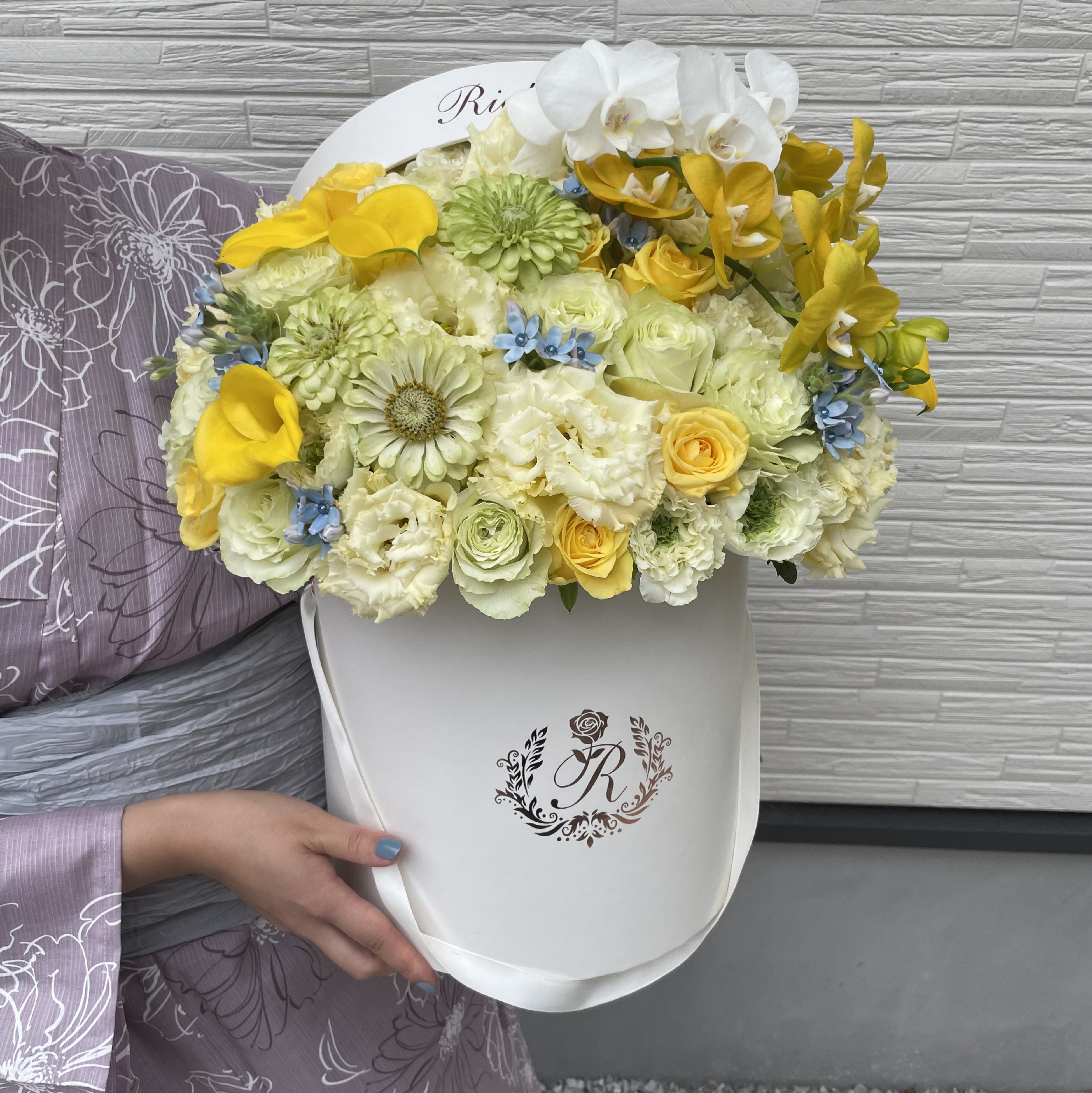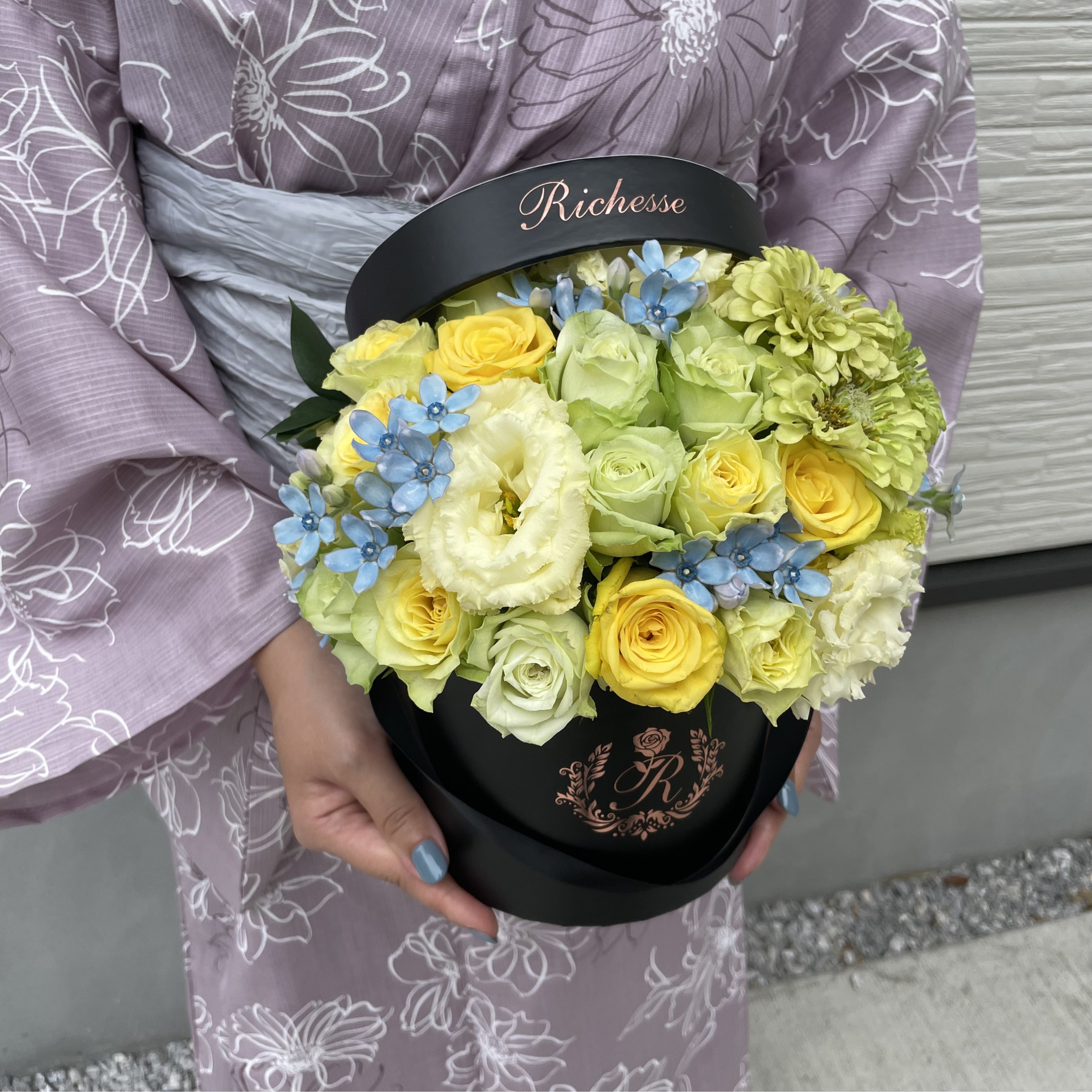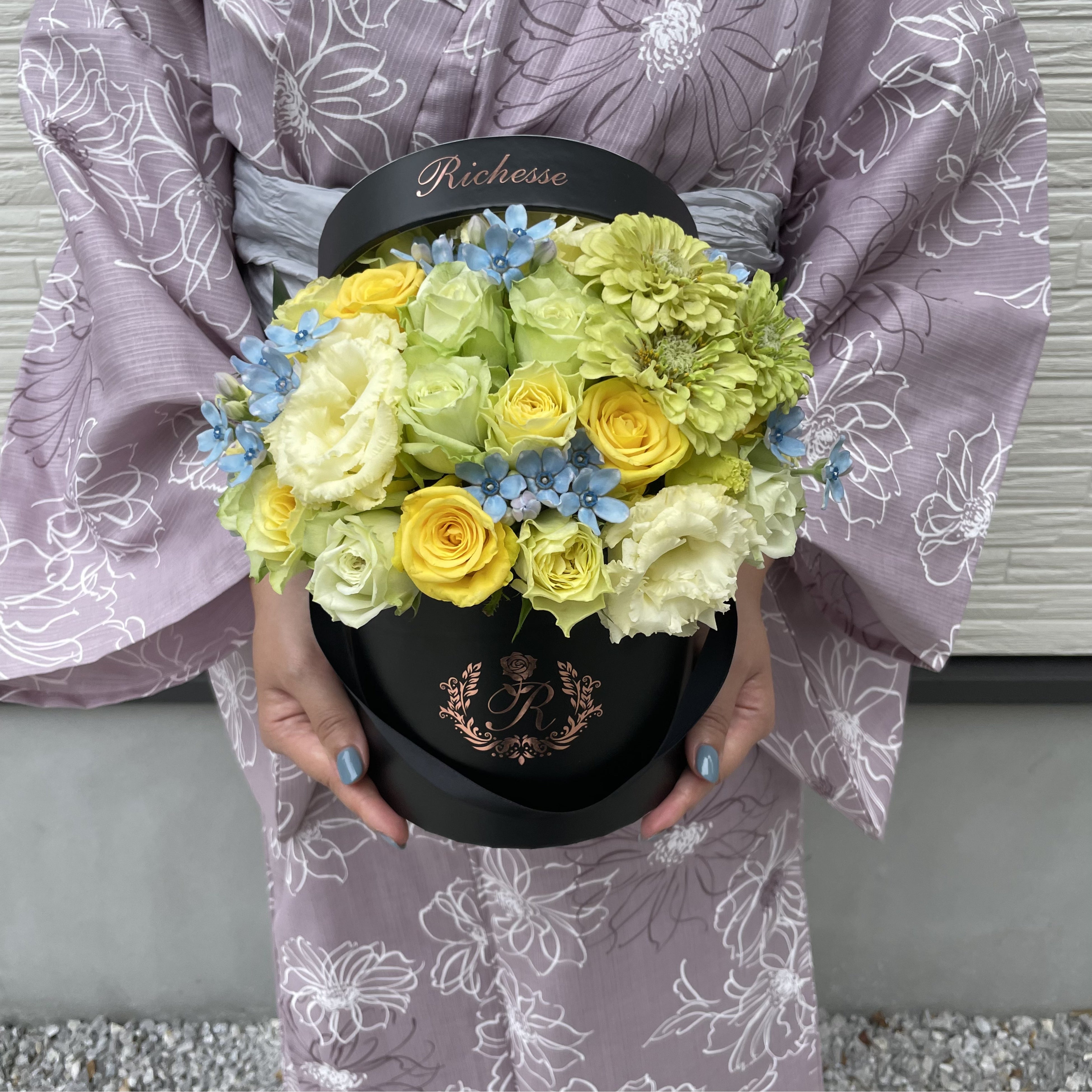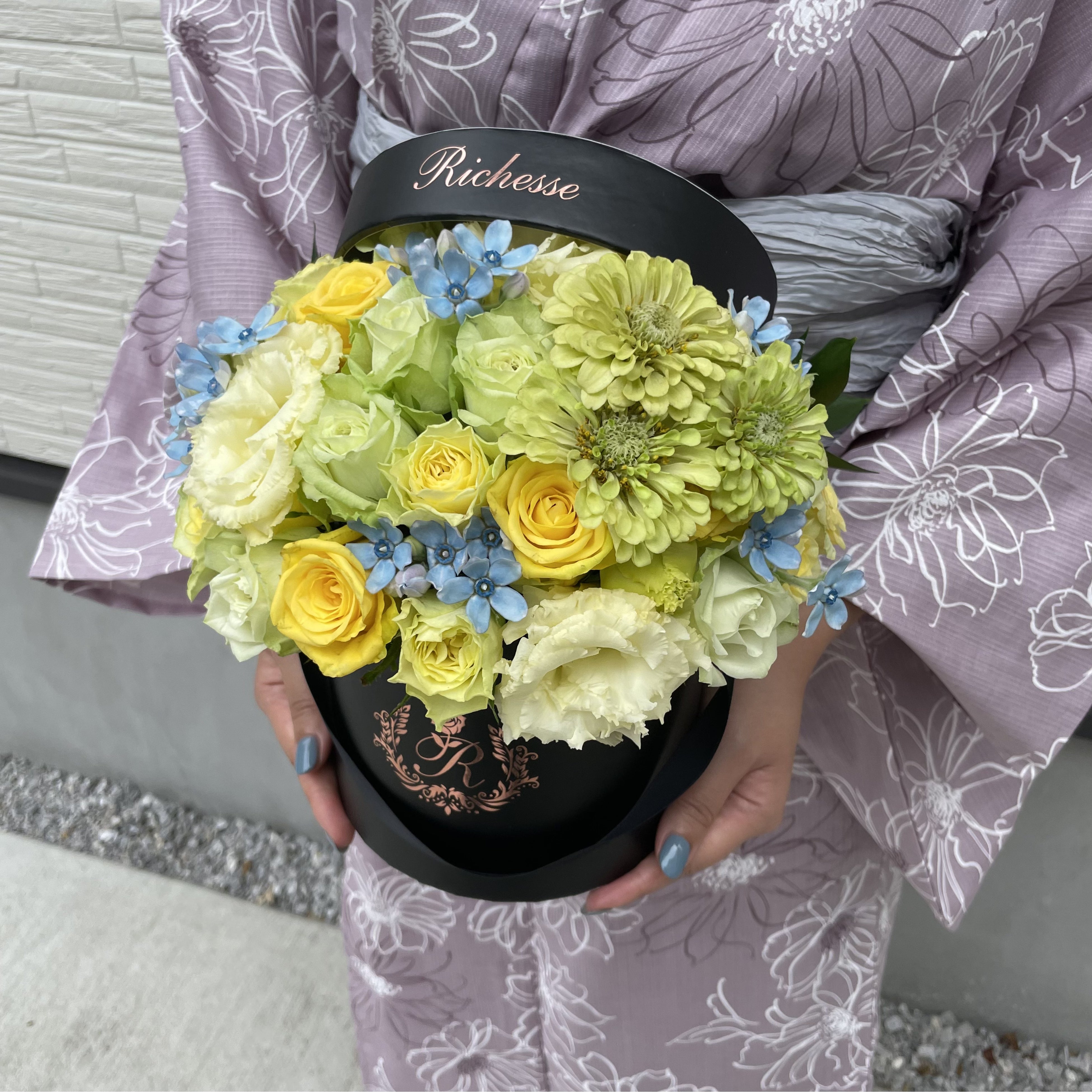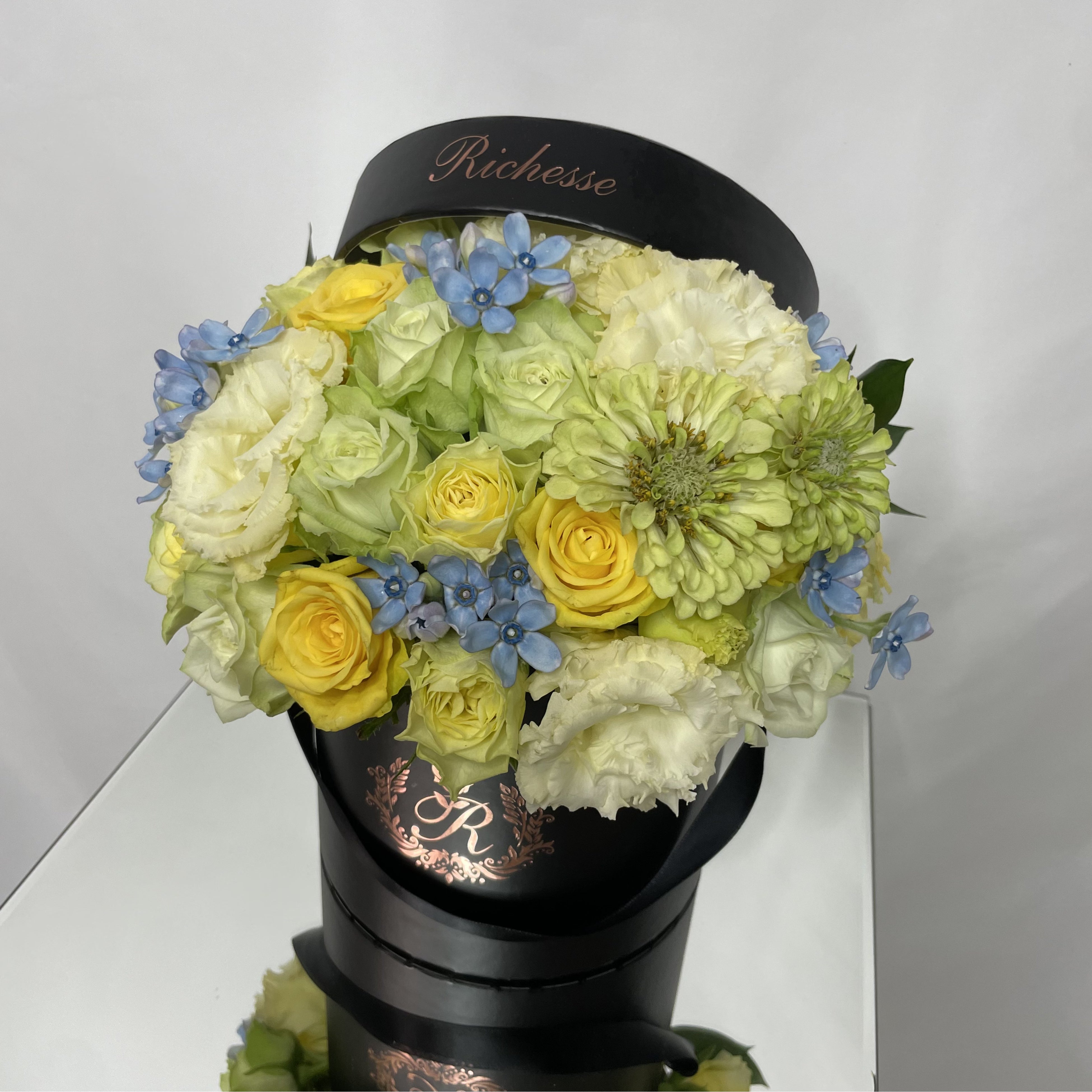 リシェスのSignature itemであるバラに加え、夏らしい黄色のトルコキキョウをベースにアレンジしたフラワーボックスです。水色のブルースターがアクセントとなり、爽やかな夏の彩りを感じるアレンジメントに仕上げました。