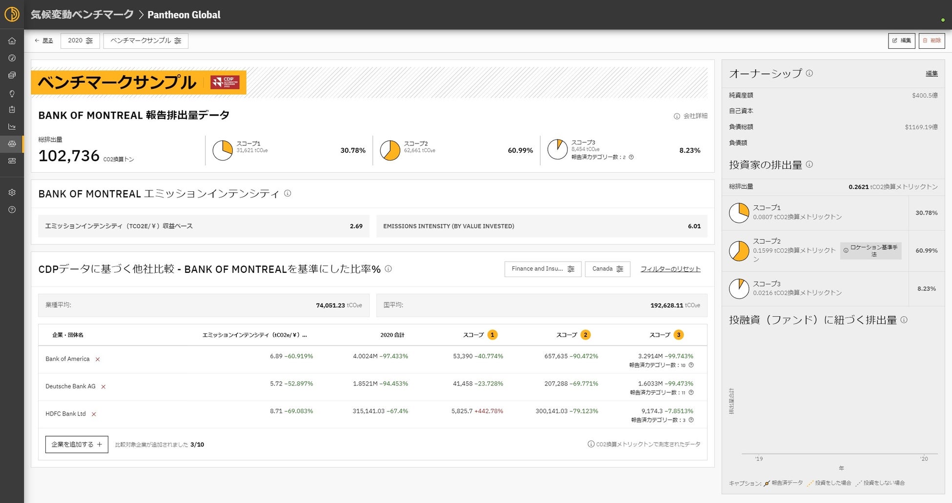 パーセフォニの「気候変動ベンチマーク」は企業や投資家である金融機関の脱炭素経営に大きな効率化をもたらす業界初のモジュールであるだけでなく、社会的・環境的にポジティブな効果をもたらすことが求められるインパクト投資(※2)の分野においても革新的な機能です。パーセフォニのプラットフォームは、企業の気候変動対策の評価活動を行うNGOであるCDP(※3)が収集する各社の気候変動に関する開示情報データと連携しており、「気候変動ベンチマーク」はCDPデータベースを用いて、炭素排出に関する多様な分析を行うことができます。投融資家である金融機関は、「気候変動ベンチマーク」を活用し、国別・業種別の平均排出量や企業別の炭素強度(※4)をベンチマーク(基準)として設定することで、投融資先のポートフォリオに優先順位をつけることができます。ベンチマーク機能を通じて、現在または今後の投融資先企業が、自社(またはポートフォリオ)の総排出量においてどの程度の割合を占めるかを把握することもできます。その他の企業(非金融業)については、最大10社の排出量と比較することで、自社の脱炭素の取り組み水準を把握すると同時に、具体的にどのスコープ(※5)で他社との差異が大きいかを確認することができます。