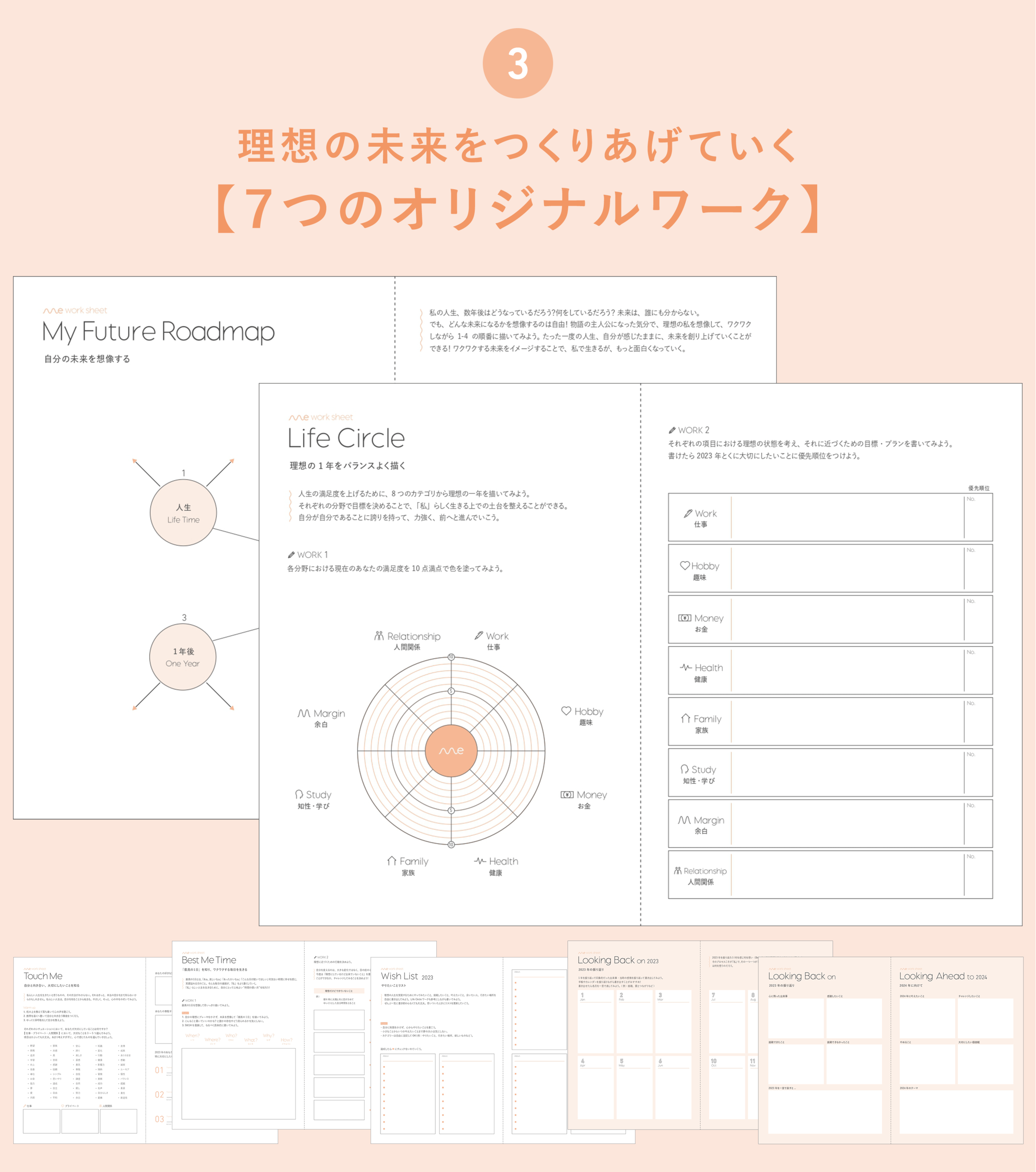 自分の本当の願いを知ることは、理想の未来を実現するために欠かせないステップ。Me手帳では数陽学に基づいた毎月のテーマ・メッセージ・セルフコーチングワークを通して、自分の心と対話し、心の奥にある願いに気づくことができます。「手帳の書き方や使い方がわからない」そんな方でも質問に答えていくだけで、自然と手帳に向き合えるようになっています。