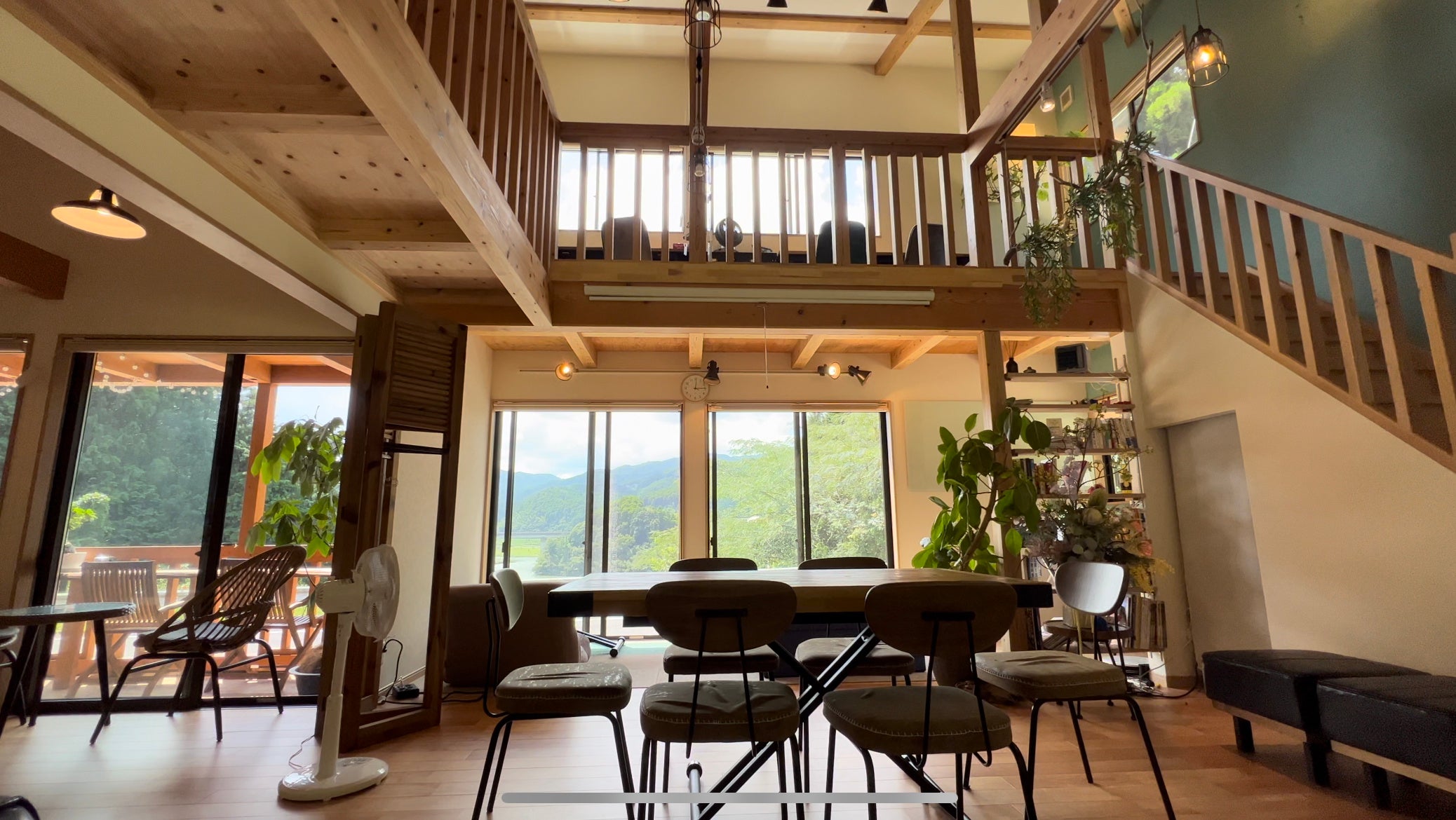 天上が吹き抜けており、窓からの眺めが開放的な店内は、木のぬくもりを保ちつつ、山なのにスタイリッシュな空間です。