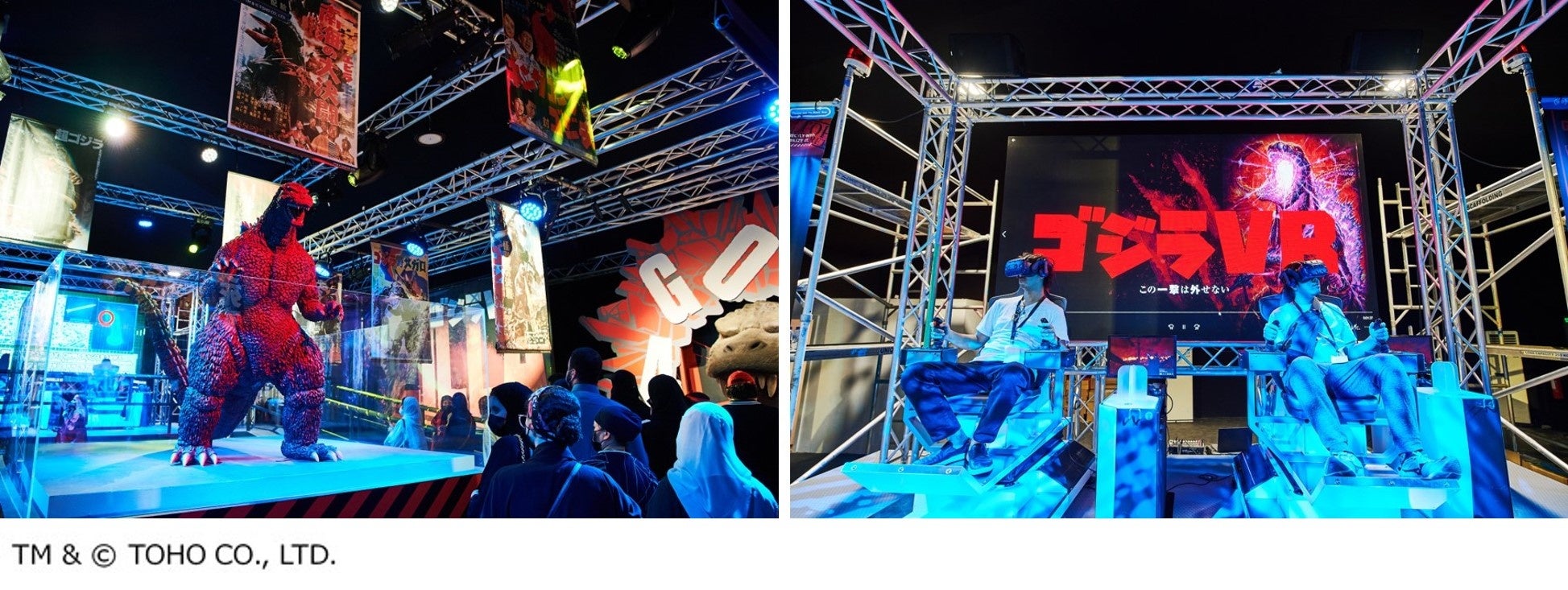 パビリオンに入ると、巨大なゴジラが出迎えてくれました。天井からは約30枚の歴代ゴジラシリーズの巨大ポスターが吊り下げられ、奥にはゴジラのVRゲームが体験できるコーナーに多くの人々が集まっていました。