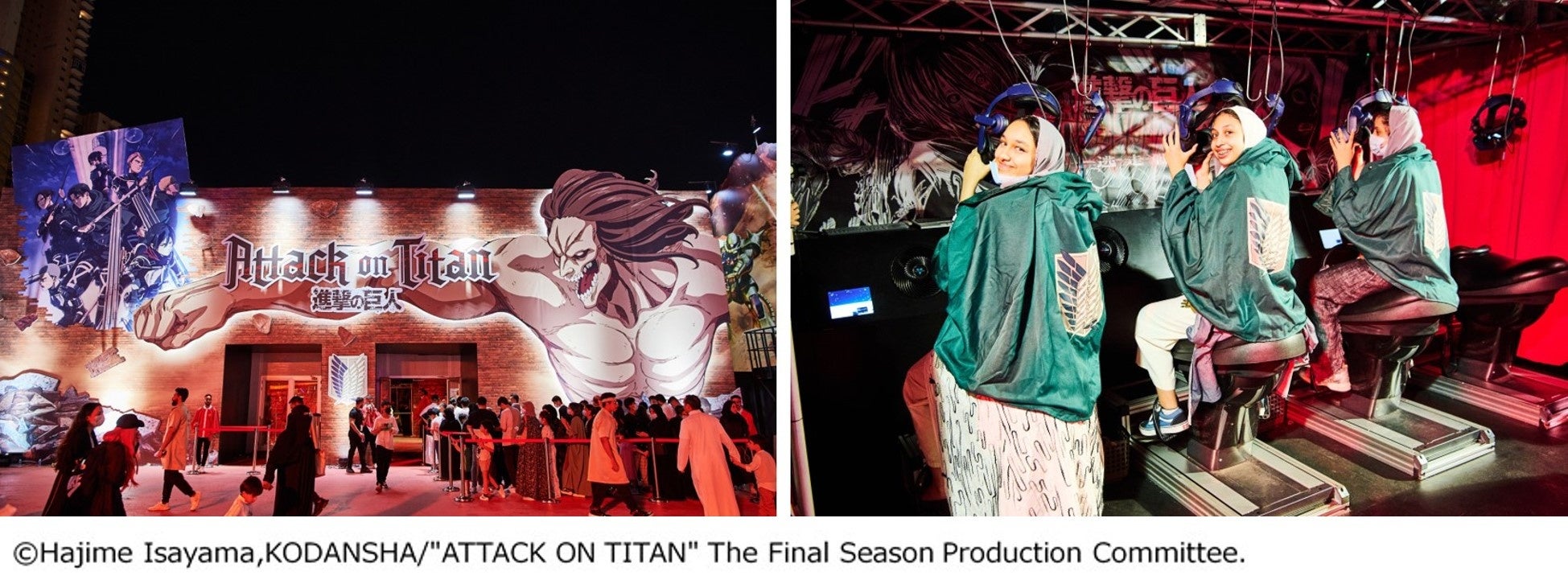 「進撃の巨人」のキャラクターパネルが並び、日本でも体験できる機会が少ないアニメの世界観を楽しめるVRゲームが体験できるパビリオン。 「アニメビレッジ」の中でも、長蛇の列ができる人気パビリオンの一つでした。
