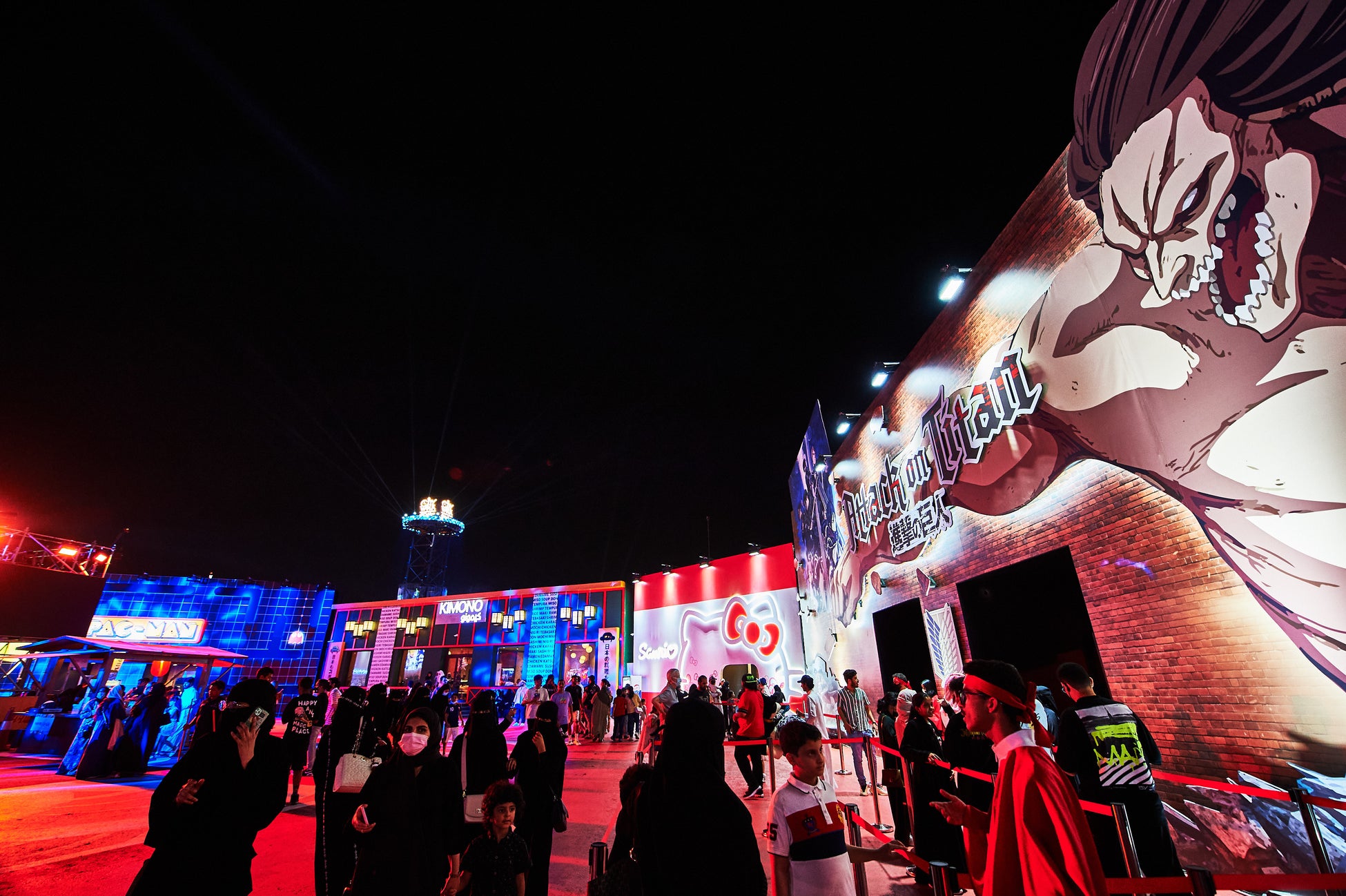 「アニメビレッジ」は、「ジェッダ・シーズン2022」のシティウォークエリアに位置する体験型イベントエリアです。サウジアラビア国内で人気の高い「機動戦士ガンダム」「鬼滅の刃」「キャプテン翼」「攻殻機動隊 SAC 2045」「ゴジラ」「呪術廻戦」「進撃の巨人」「NARUTO」「パックマン」「HUNTER×HUNTER」「BLEACH」「僕のヒーローアカデミア」(50音順)といった12のアニメコンテンツの体験型パビリオンと、関連グッズを販売する「アニメイトショップ」や「サンリオショップ」が出店しました。