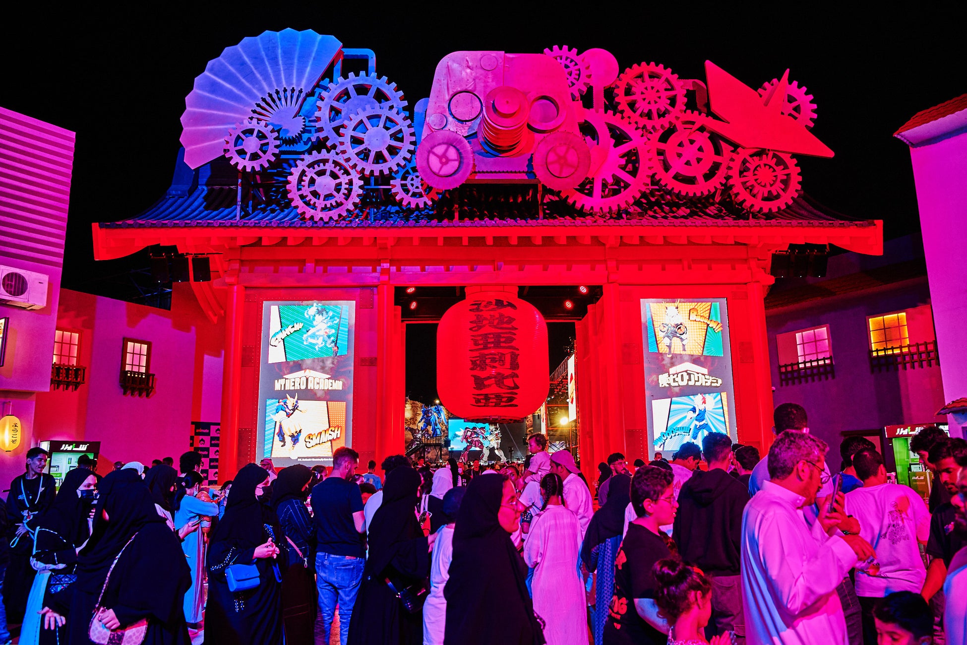 日本文化を象徴する雷門。中央の大提灯には「沙地亜剌比亜(サウジアラビア)」の文字。 左右のデジタルサイネージには、今回参加しているアニメコンテンツの映像が流れており、「アニメビレッジ」を訪れた人が記念撮影をする映えスポットとしても注目を集めました。