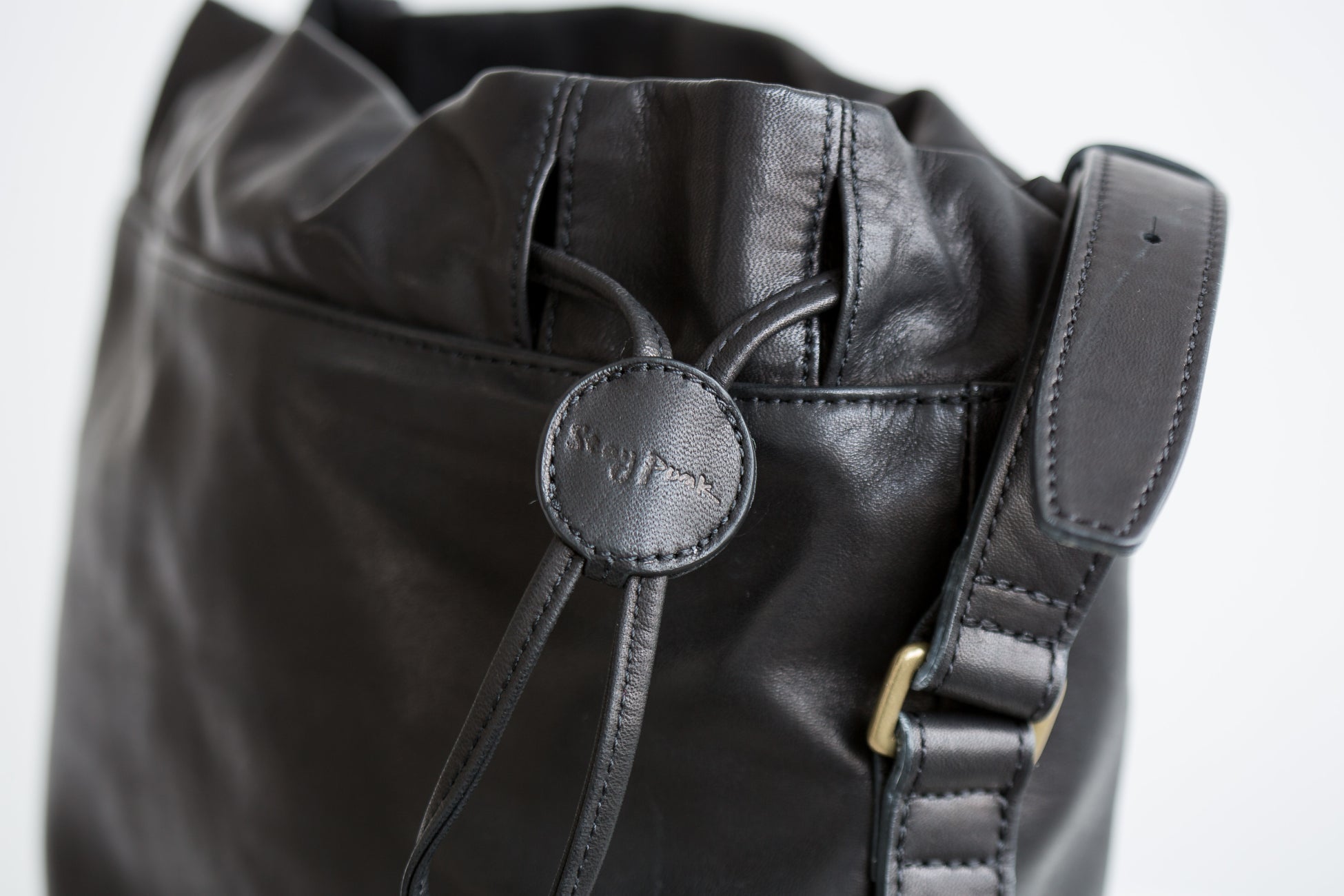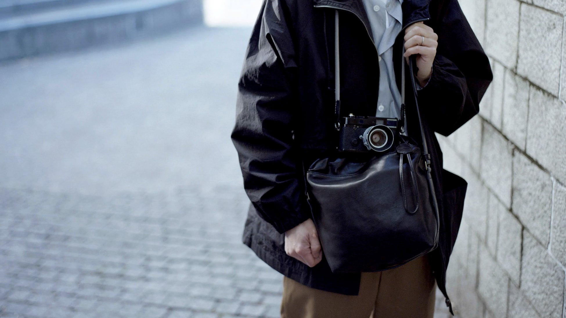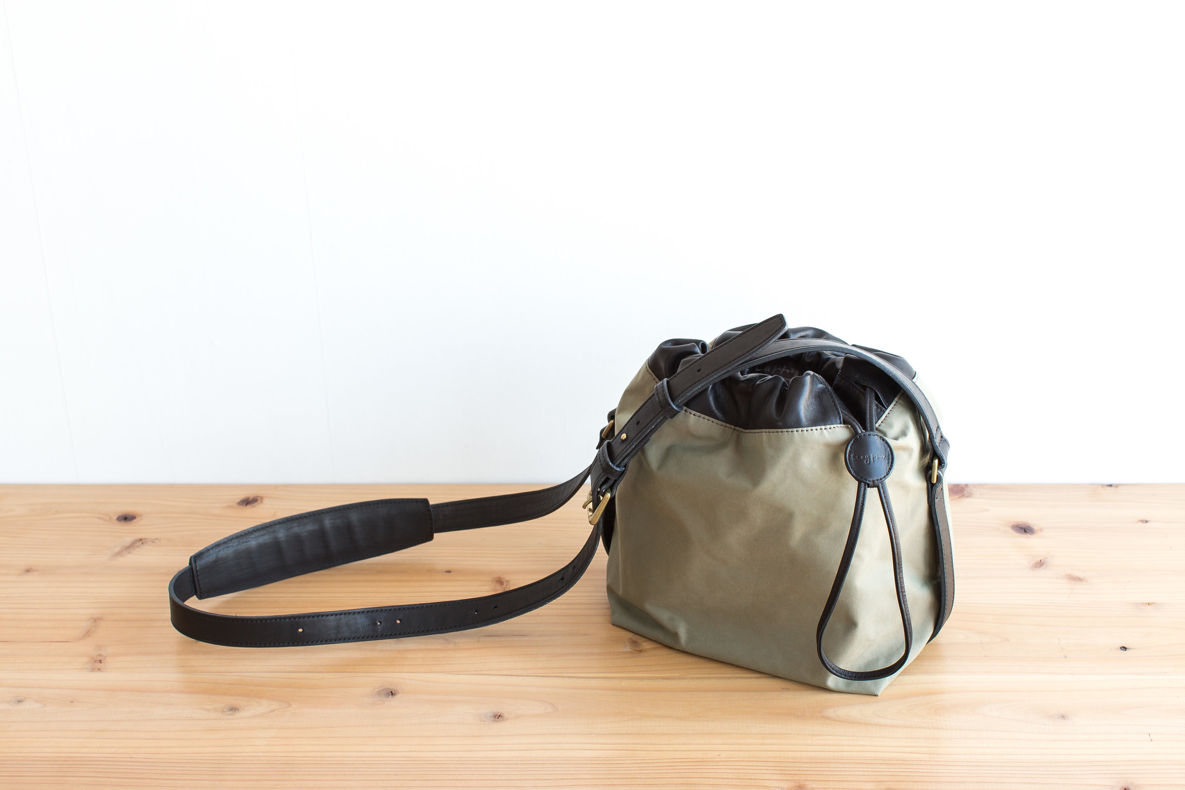 紐を少し横にずらして、カメラが重なりあってもバッグのディテールに邪魔する要素がないバッグをデザイン。巾着部分の開口部は、ホースハイドのしなやかさを活かして、前後4か所のスリットから1本の紐を一気に締め上げる方法を採用しました。