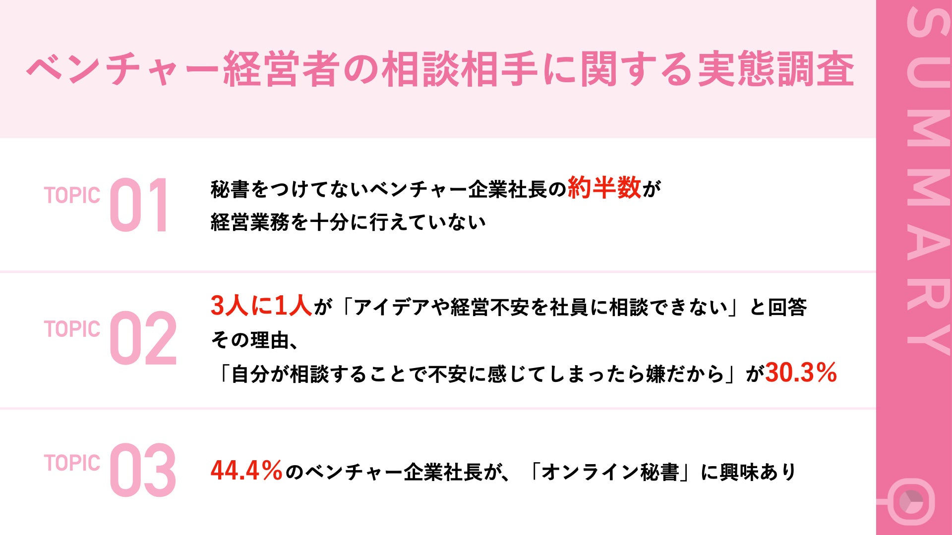 今回の調査では、秘書をつけていないベンチャー企業経営者の半数近くが、経営業務を十分に行えていない状態であり、また3人に1人が思いついたビジネスアイデアや経営の不安などを気軽に相談できる相手がいないという実態が明らかとなりました。ベンチャー企業にとって、ビジネスアイデアをいかに早く実行に移すかが鍵となっています。オンライン秘書のような相談相手がいる・いないでは、ビジネスの成長スピードに大きな差が出るでしょう。毎日忙しく過ごしているベンチャー企業の経営者にとって、日々の雑務から解放され、時に思いついたアイデアを整理したり、客観的な視点から提案をしてくれるようなサポート役の存在を確保することが、ビジネスを円滑に進める上で、重要だと言えるのではないでしょうか。