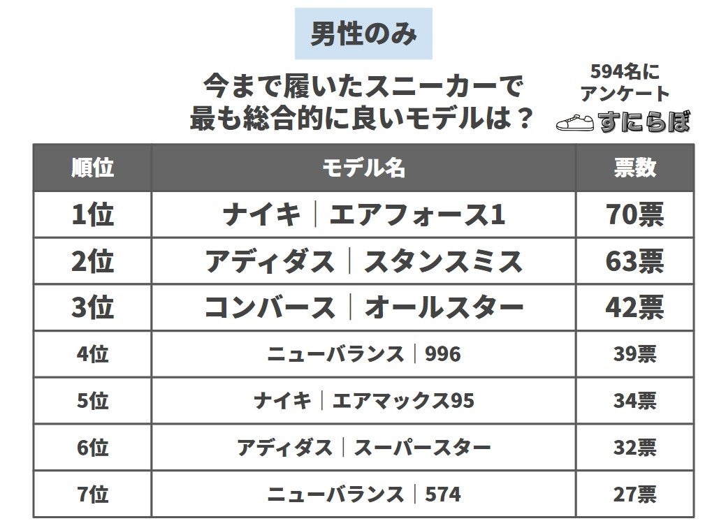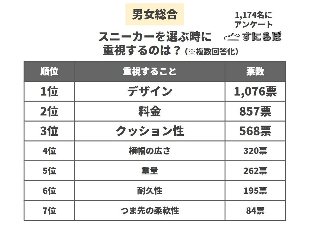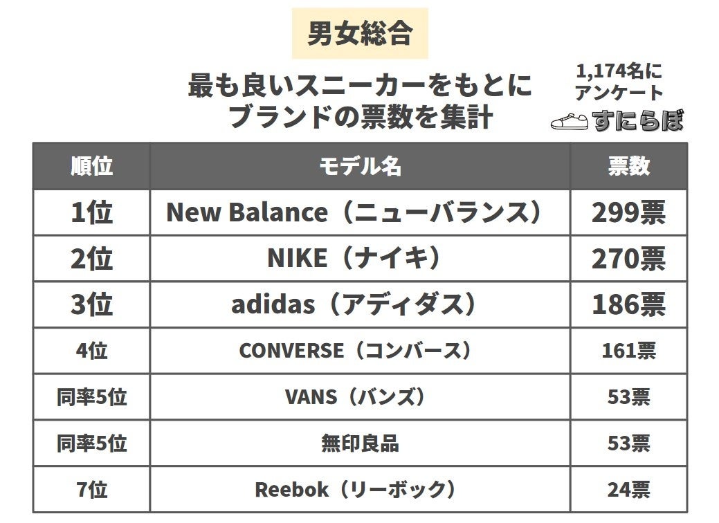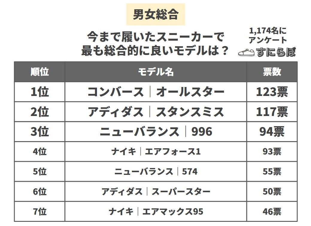 スニーカー専門メディア「すにらぼ」(https://sneakers-labo.com/)は、スニーカーを3足以上持っている男女1,174名に「最も総合的に(デザイン・料金・クッション性など含めて)良いスニーカー」のアンケート調査を実施しました。その結果を公表します。
