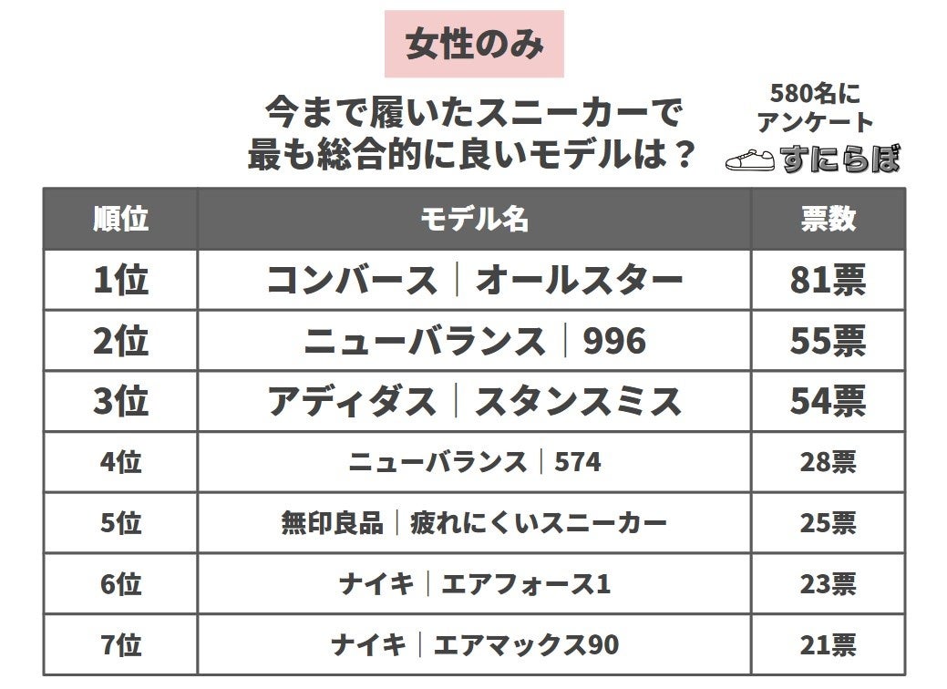 - ①男女総合で最も良いスニーカーは「コンバース オールスター」