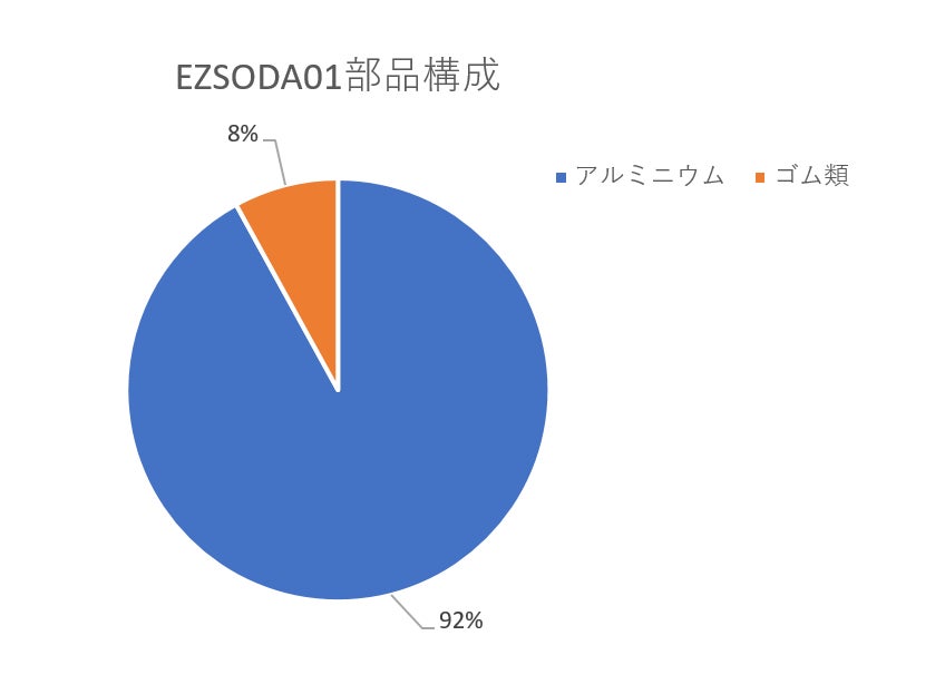 「EZSODA01」は最小の部品点数、部品種数となるよう設計を行っています。また本体部の重量の92%以上がリサイクル可能なアルミ素材で構成されています。他の8%はゴム類の部品で油化等、リサイクルできる可能性があります。