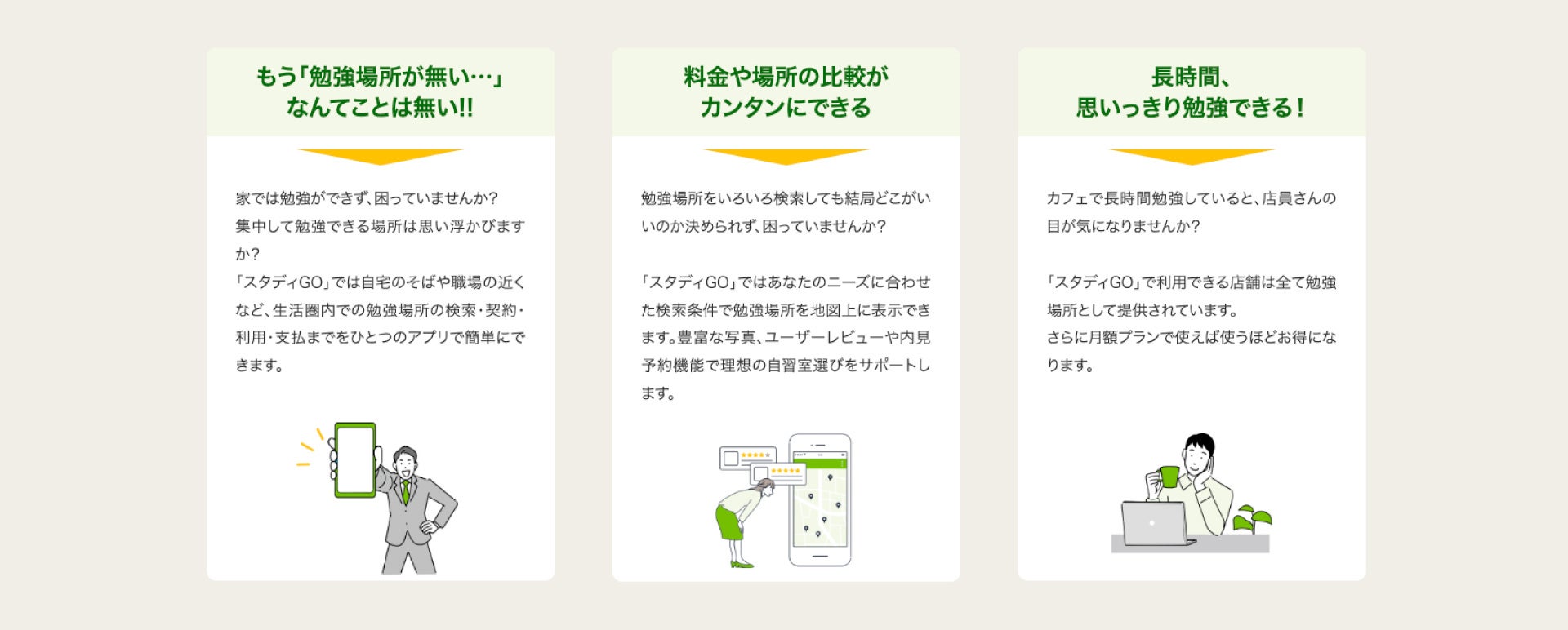「勉強できる場所」を探しているユーザーと、「勉強できる場所」を持っている店舗をつなげます!