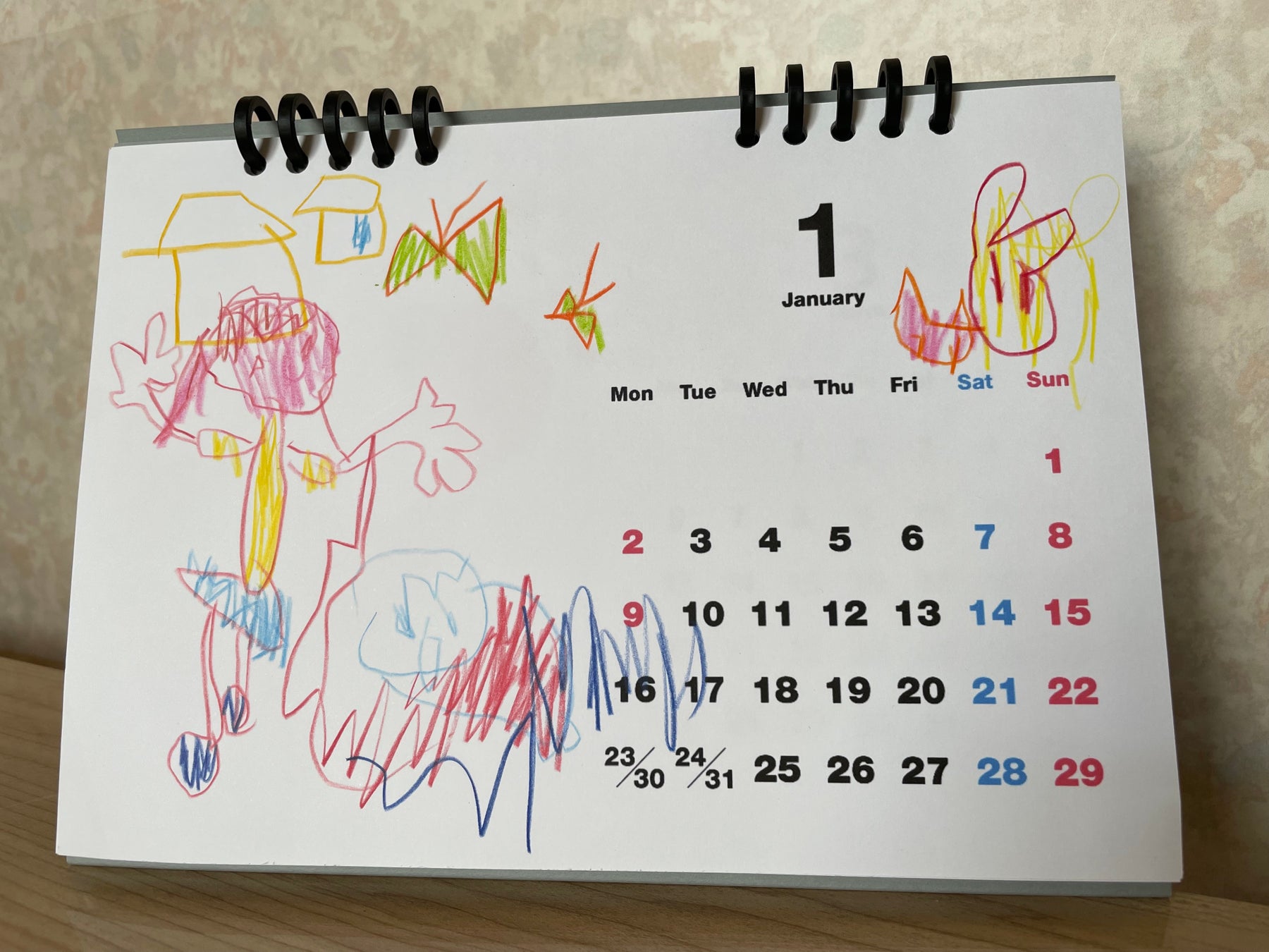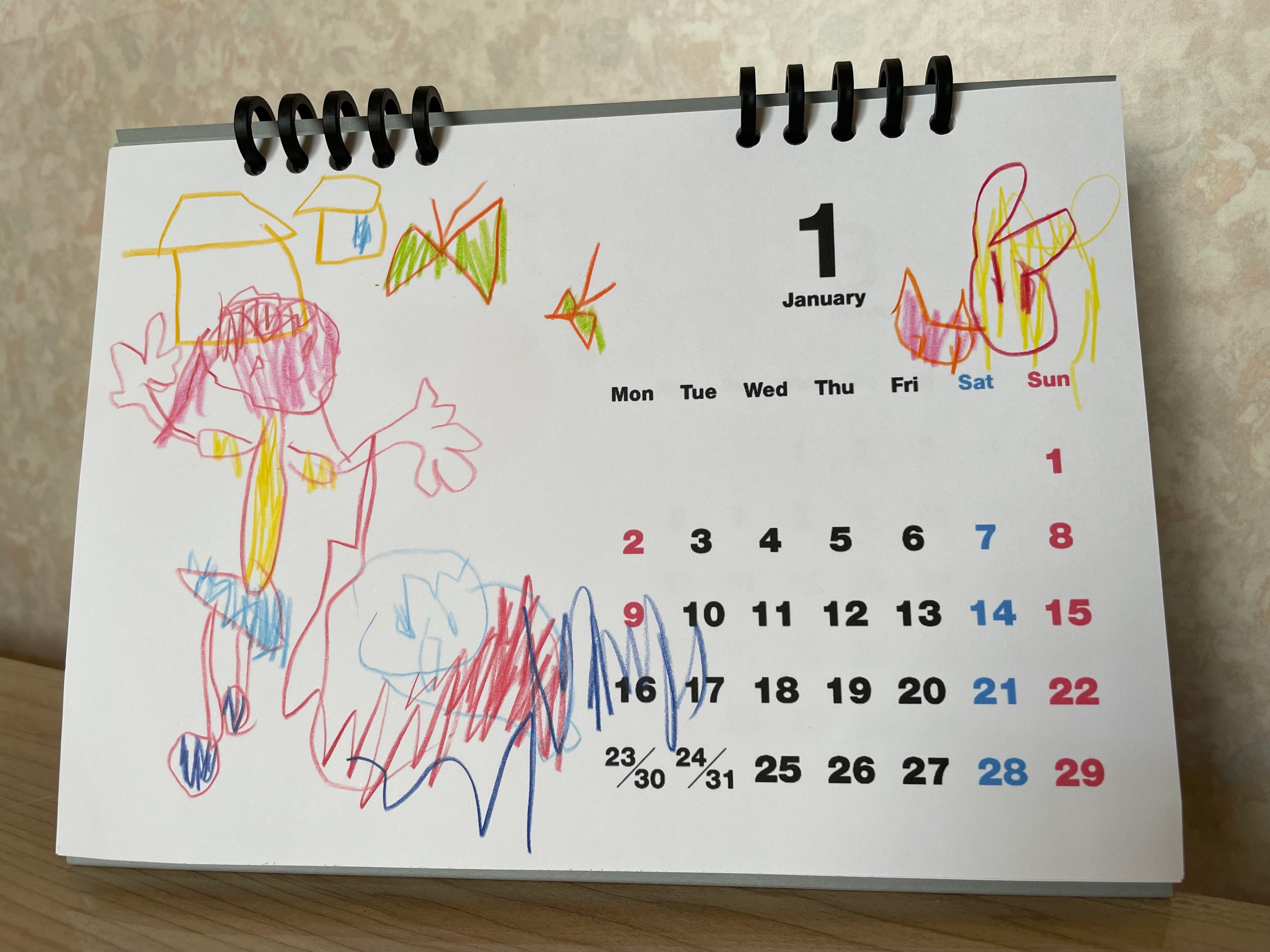 カレンダーには、お孫さんのお絵描きや写真が載っています。