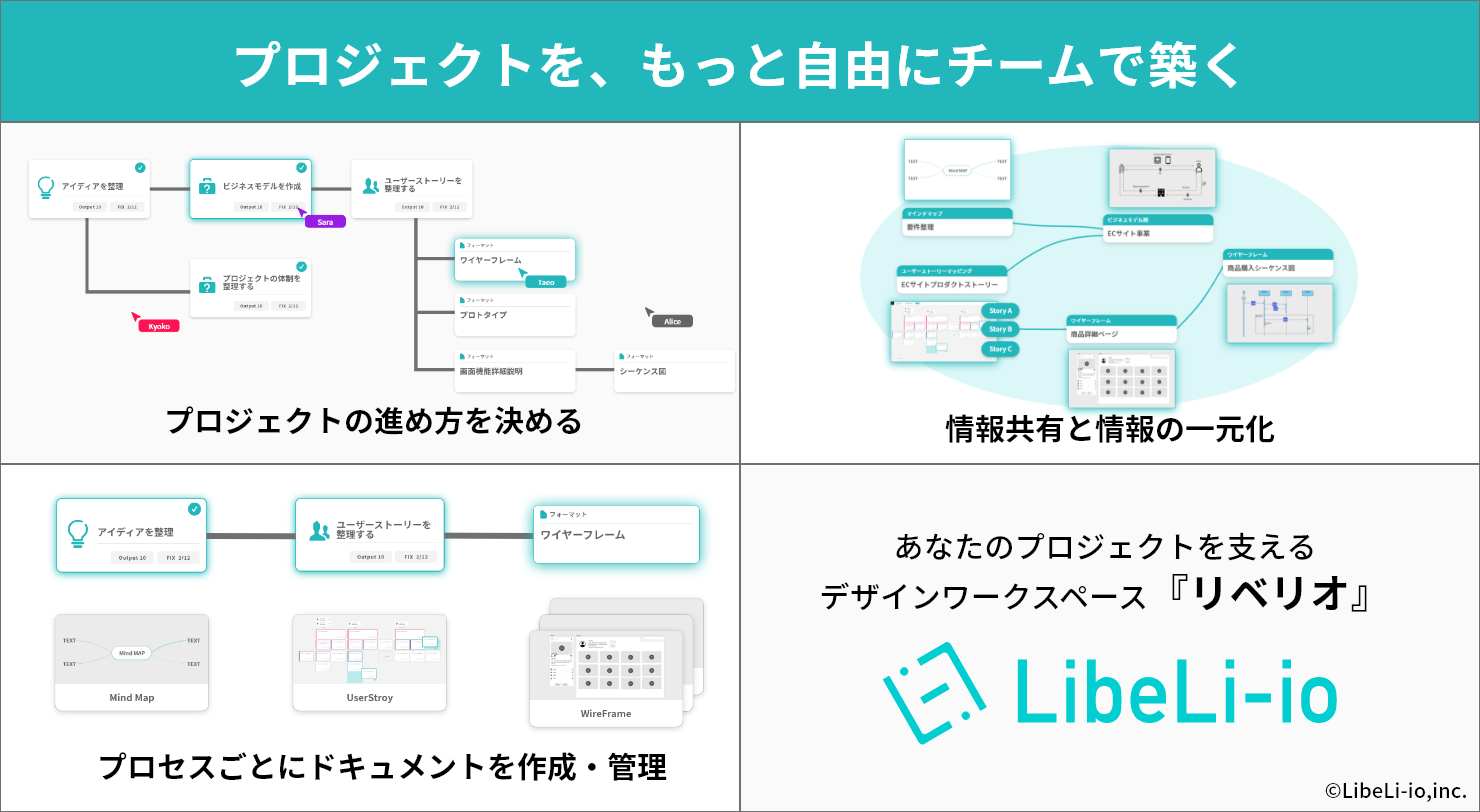 LibeLi-ioは、チーム開発で必要不可欠な『全体の進め方』と『各プロセスのアウトプット』をビジュアルで分かりやすく作成管理することが出来ます。チームのコラボレーションを一層強化する新しいツールをぜひご体験ください。