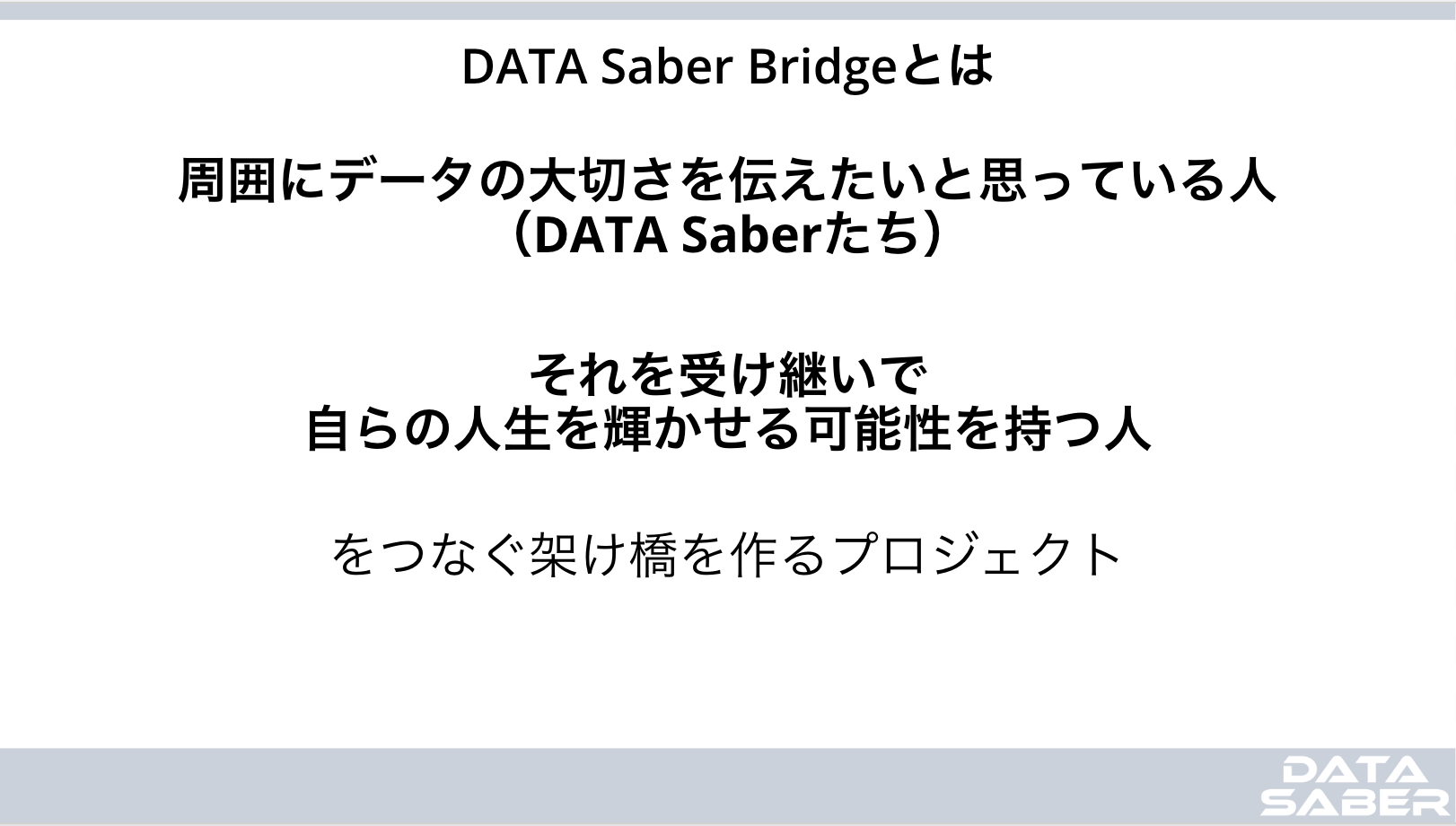 『DATA Saber』では、周囲にデータの大切さを伝えたいと思っているデータ分析スキルをもった人々を「DATA Saber」と呼んでいます。その想いを受け継ぐ、その力を受け継ぐ人を繋ぐために、『DATA Saber Bridge』は発足しました。DATA Saberと、新たにDATA Saberとなる人の架け橋を作るプロジェクトが、まさに『DATA Saber Bridge』です。