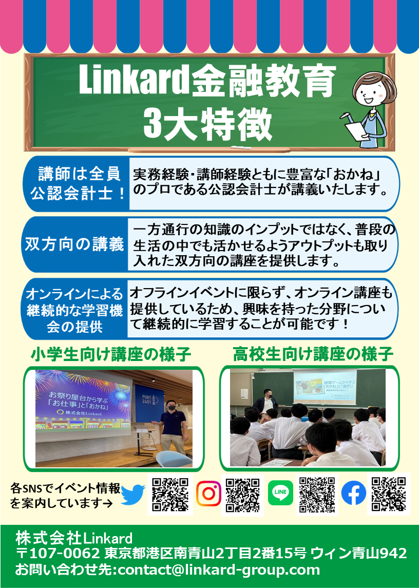 ご参加に際しましては、予約ページ(https://coubic.com/linkard/822339)よりご予約お願いいたします。経済のデジタル化・グローバル化に伴い、今後更にマネーリテラシーの重要性は増していくと考えられるため、この機会に是非ご参加頂けますと幸いです。