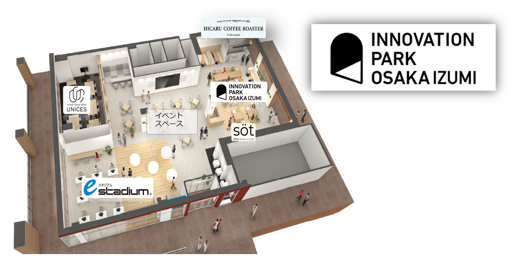 主なコンテンツとしまして、地域の皆さまが、eスポーツを健全かつ健康に親しむことで、プレイヤーの活躍を地域とともに支援する施設「eスタジアムいずみ」、あらゆる子どもたちの将来の不安点を解消すべく、自立した思考力を育むプログラミング教室「UNICES(ユニセス)」、企業様や地域の“コマリゴト”を学生との共同プロジェクトを通して解決するコミュニティラウンジ「INNOVATION PARK OSAKA IZUMI」、ダウン症の方々と共創するコーヒースタンド「HICARU COFFEE STAND」、人や地球にそっとやさしいショールーミングスペース「söt(ソット)」、また、各々のコンテンツを発信する場として、大型モニターを設置したイベントスペースを配します。