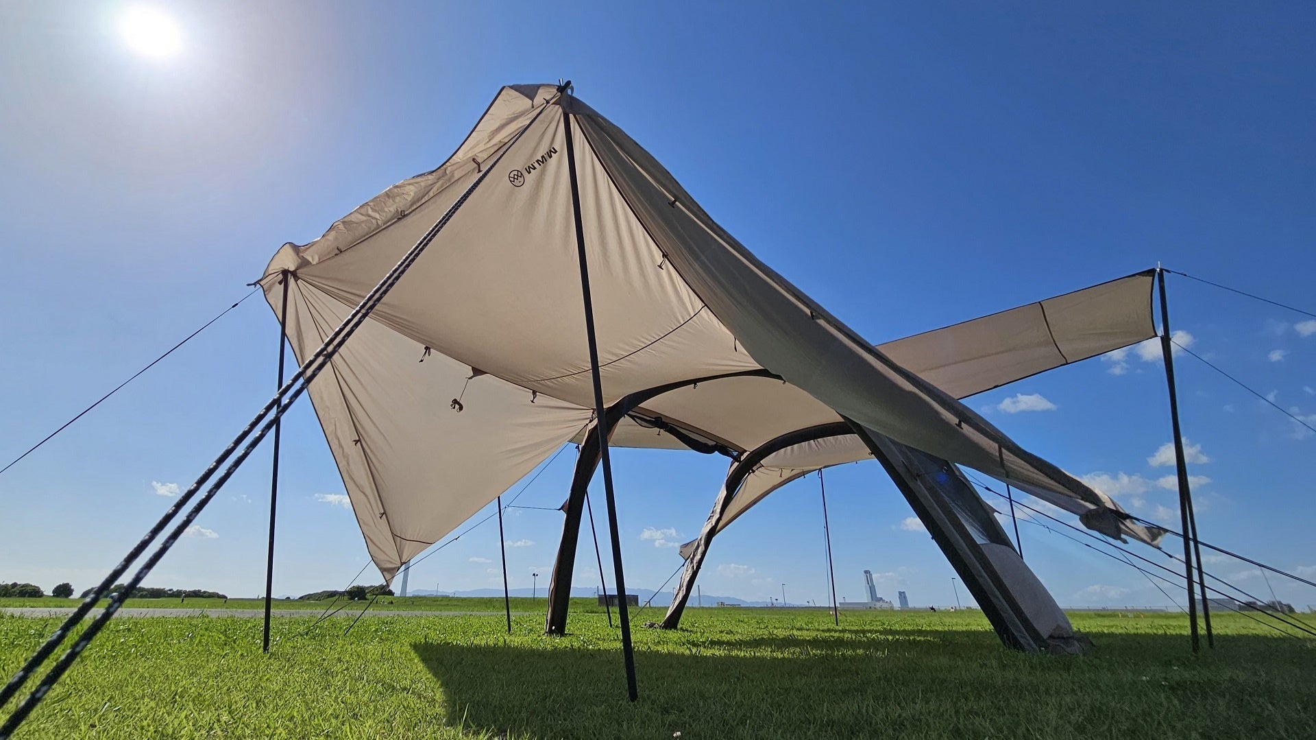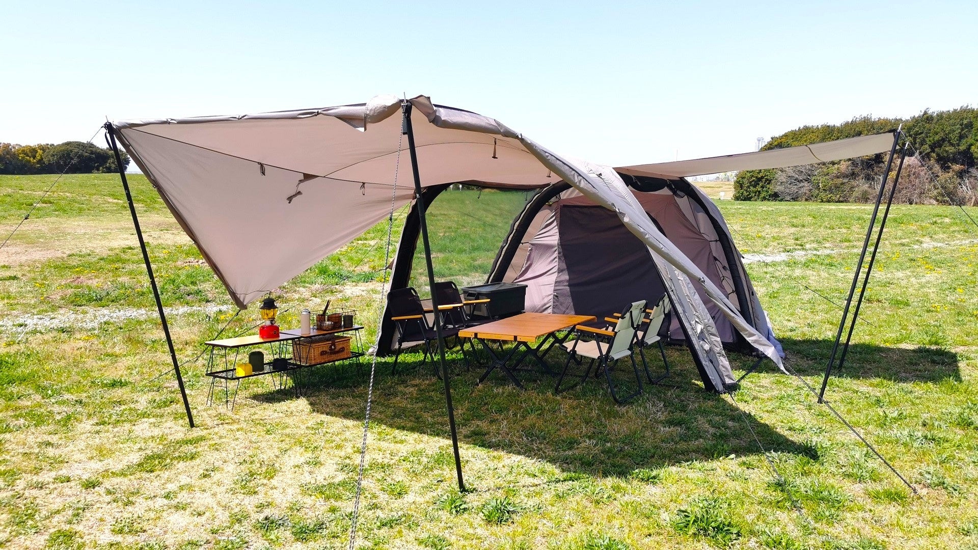 オプションポールを使用しいろんな形状にアレンジでき、最長7mのスペースは大人数のグループキャンプのリビングスペースとして活躍します。
