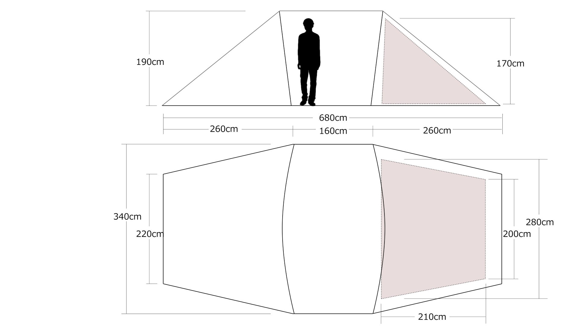 ・組立サイズ:(約)680cm×340cm×高さ190cm、インナーサイズ:(約)280cm×210cm×高さ170cm