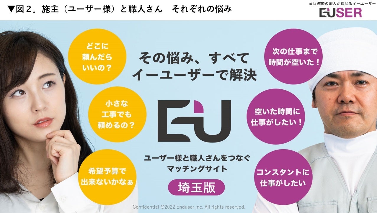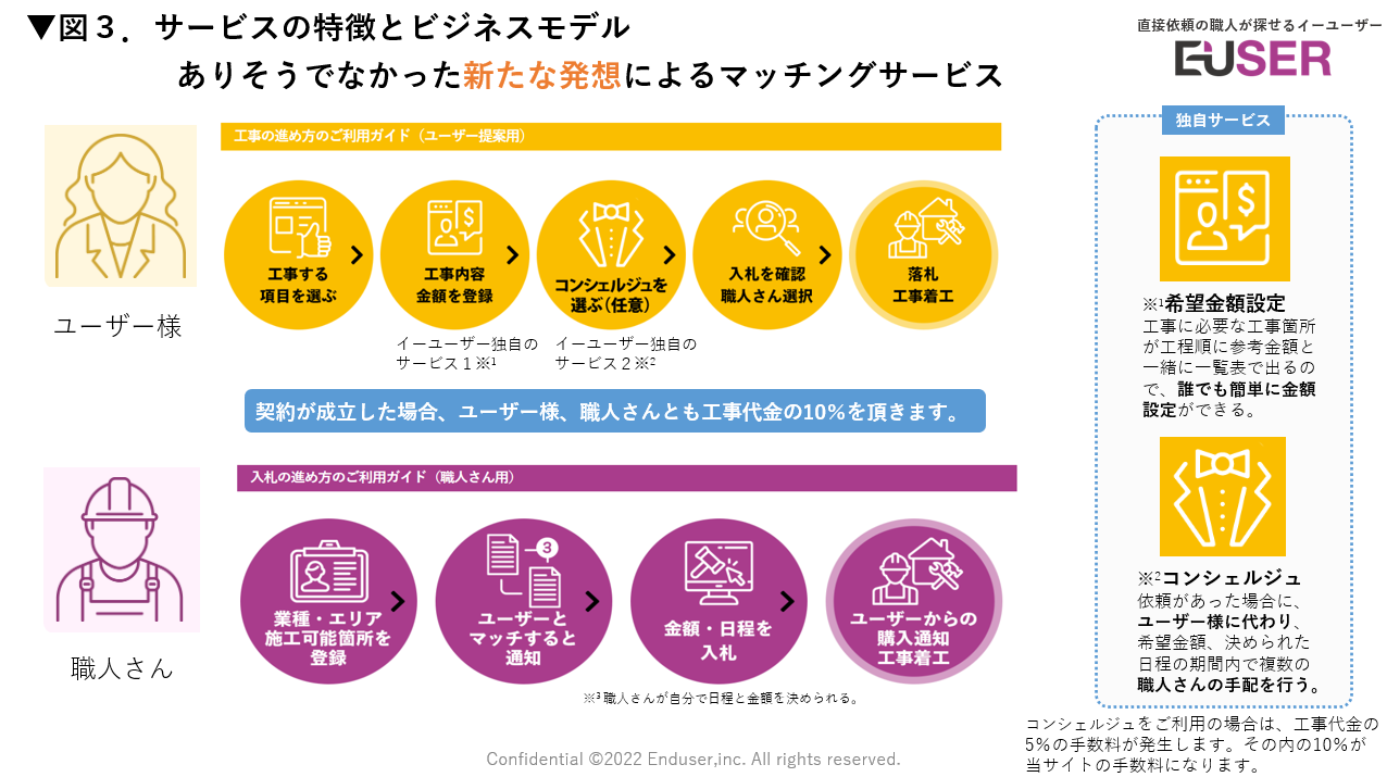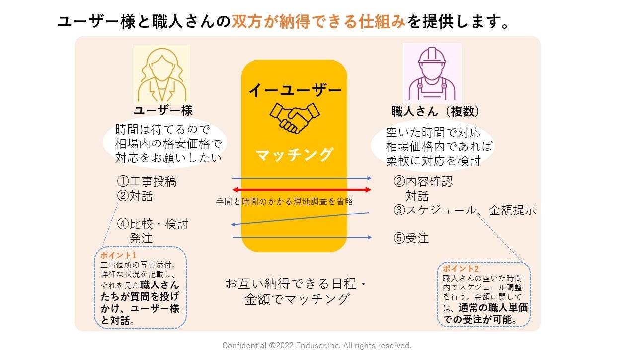 上述の課題を解決する為、企画・開発準備に5年かけ、これまでになかったマッチングサイトとして、リフォームの公開市場”イーユーザー”のβ版を6月15日オープンします。