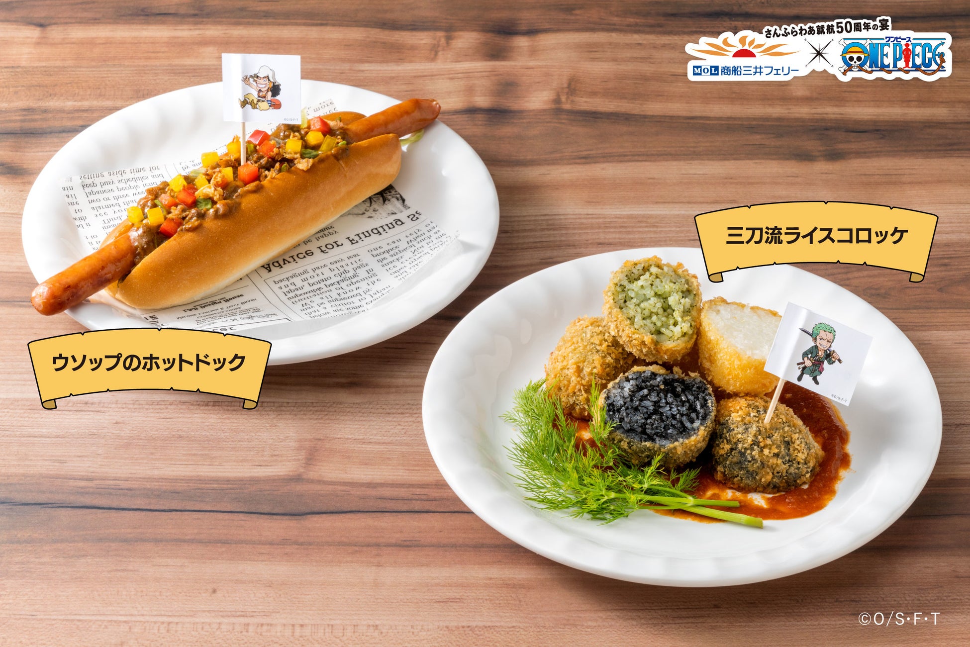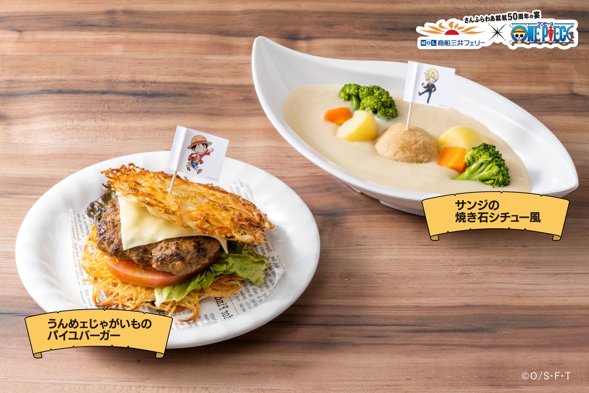 「ウソップのホットドック」、「サンジの焼き石シチュー風」など「ONE PIECE」のキャラクターにちなんだフードやドリンクメニューを提供します。