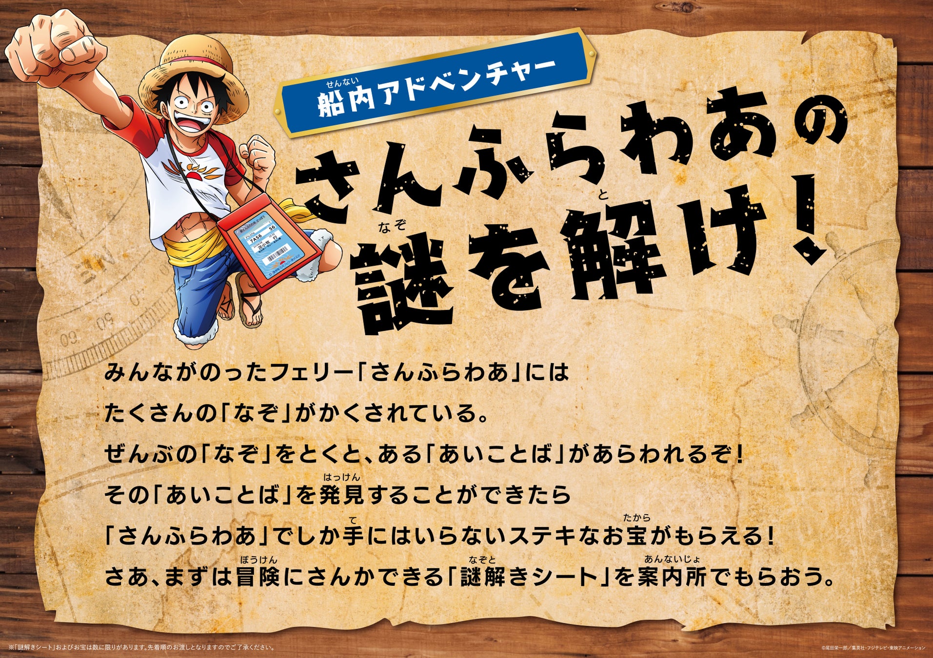 船内では、船の中に隠された謎を解いていき、すべての謎が解けるとお宝をゲットできる船内アドベンチャー「さんふらわあの謎を解け!」や、「ONE PIECE」のキャラクターにちなんだコラボメニューやオリジナルグッズの販売など、船旅をよりお楽しみいただけるイベント「さんふらわあ就航50周年の宴」を開催します。