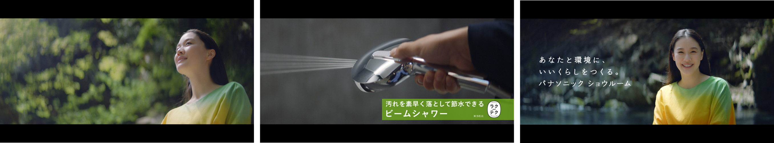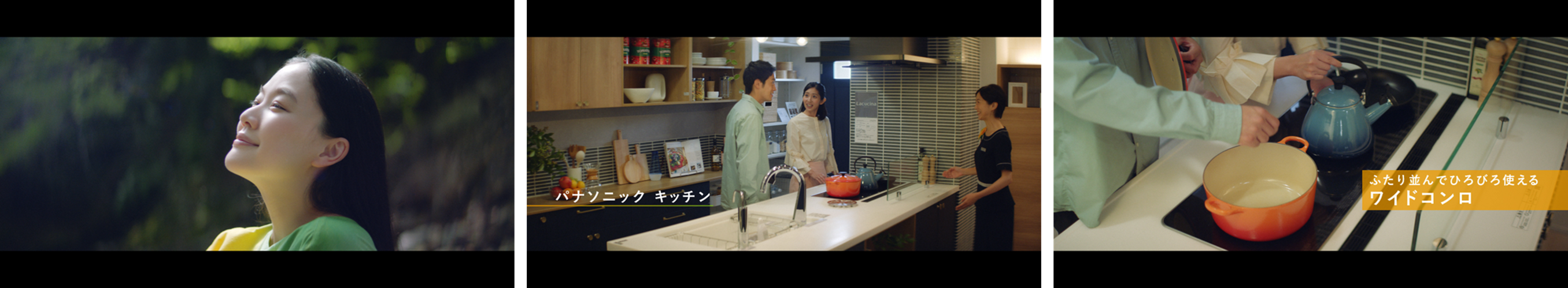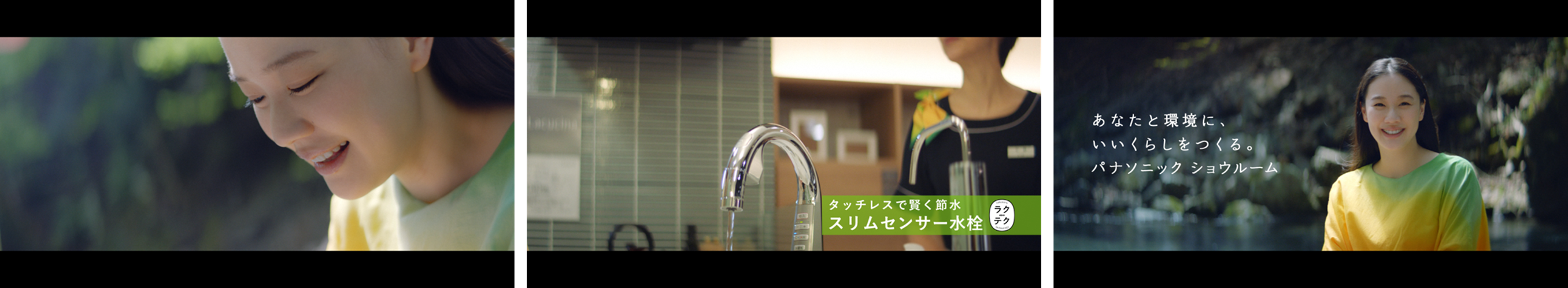 本CMでは、蒼井さんの出演シーンの後、パナソニック ショウルームを訪れた来場者が映し出され、ふたりで並んで料理を楽しむことができるワイドコンロ搭載のシステムキッチン「ラクシーナ」や、ビームシャワーで掃除が楽にできる新シリーズのバスルーム「BEVAS (ビバス) 」を紹介。水の無駄遣いを抑えながら快適に使用することができる商品を通じて“あなたと環境にいいくらし”に出会うショウルームが描かれています。