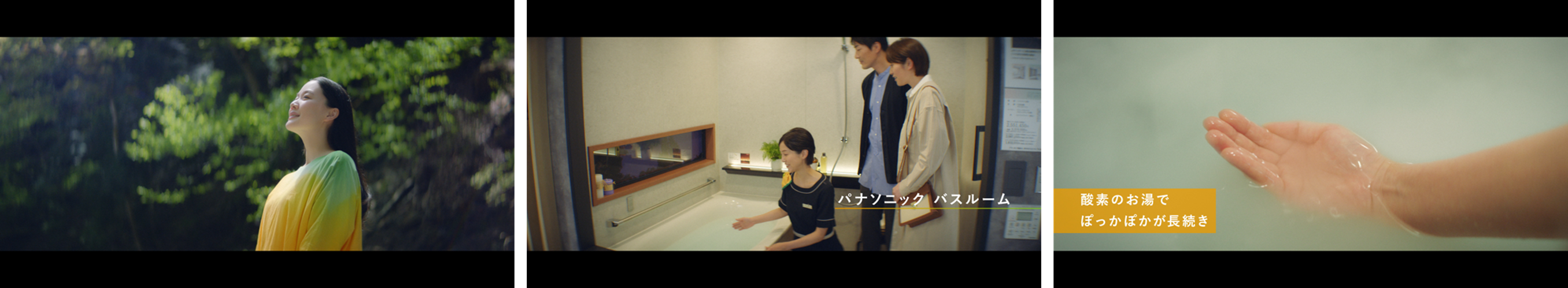 清流のそばで深呼吸をする蒼井優さん。パナソニック ショウルームでアドバイザーから説明を受ける来場者の映像とともに、「汚れを素早く落とす新搭載ビームシャワー」「酸素の泡でぽっかぽかが長続きの酸素美泡湯」が特長のパナソニックのバスルーム「BEVAS(ビバス)」の魅力を伝えます。