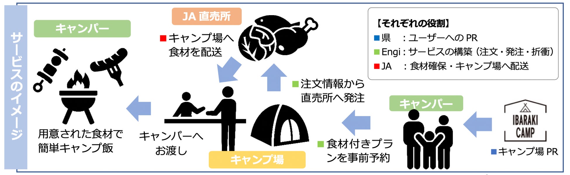 日本ファン創出等に取り組む 株式会社Engi(本社:横浜市、代表取締役:羽田野裕義)は、茨城県(茨城県知事 大井川和彦)、全国農業協同組合連合会 茨城県本部(県本部長 鴨川 隆計、以下JA全農いばらき)と共に、キャンプ場と地域のJA直売所をマッチングし、キャンプ場に地場産のバーベキュー食材セットが配送されるサービス“TerroirCAMP(テロワールキャンプ)”を2023年2月に開始致します。