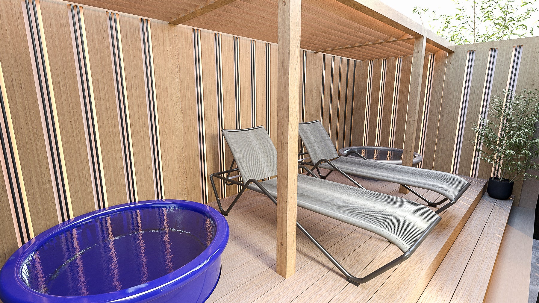 テラスは、北欧風の温かみのある木材を基調とした外気浴と露天風呂を十分に楽しめる空間に。冷浴露天風呂と温浴露天風呂の両方を備えているので、最高のリラックス空間を演出。外気浴で“至高のととのい”を体験するには欠かせない、“ととのい椅子”もご用意いたしました。