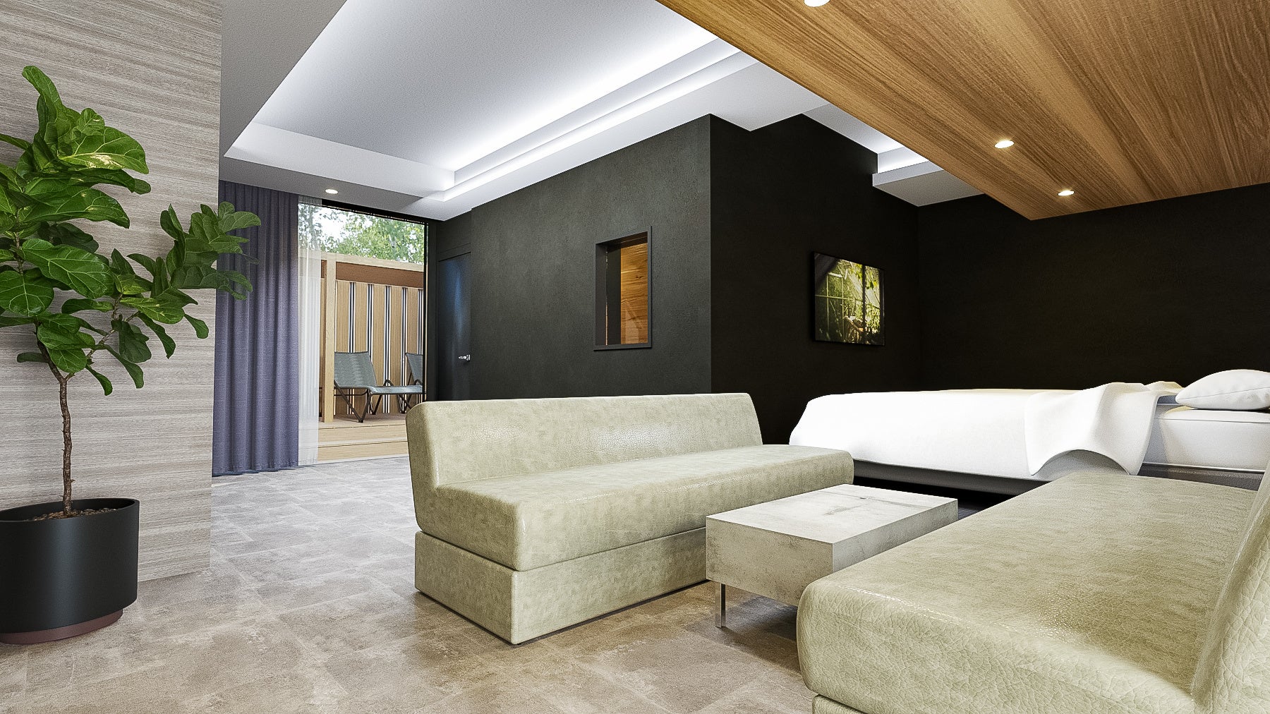 バス・トイレ・キッチン・生活家電がついた全5タイプの中長期滞在型客室と、プレミアムサウナルームをご用意いたしました。
