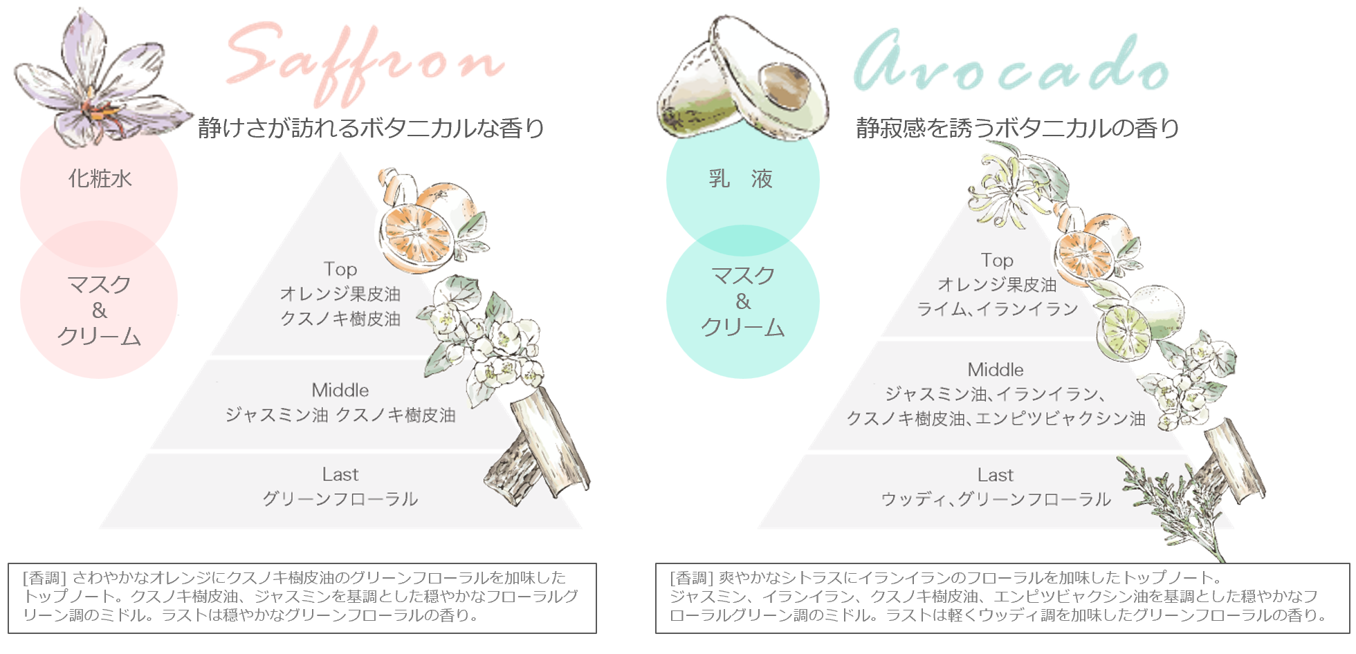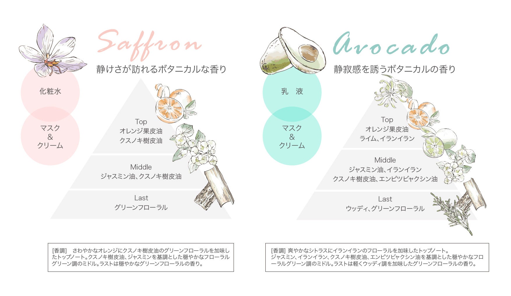 敏感肌・乾燥肌を考えた低刺激処方。サフランエキスと和漢植物エキスを配合した敏感肌に特化した化粧水とマスク。森のバターと呼ばれるアボカドオイル・アボカドエキスと、過酷な環境に負けない植物エキスを配合した高保湿型美容乳液とマスクのケアラインナップ。