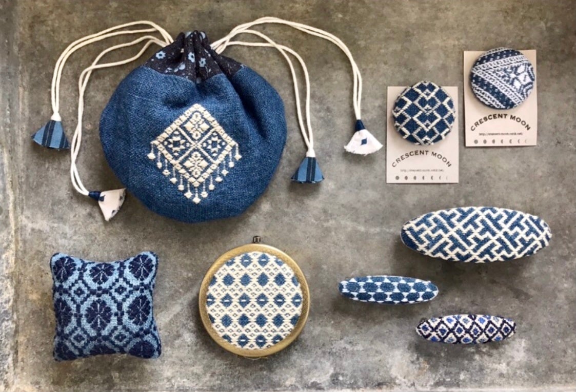 麻100%の生成り生地の作品が中心ですが、その生成り生地を藍染や墨染めに染めることでこぎん刺し表情もグッ