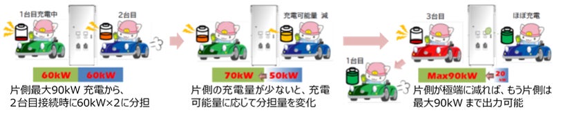 ※2台のEV充電時に、それぞれの充電量に応じて出力を動的に制御することで、充電時間を最適化します。(ダイナミック充電対応車両に対して有効)