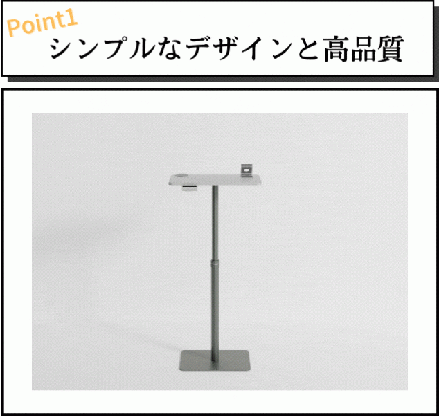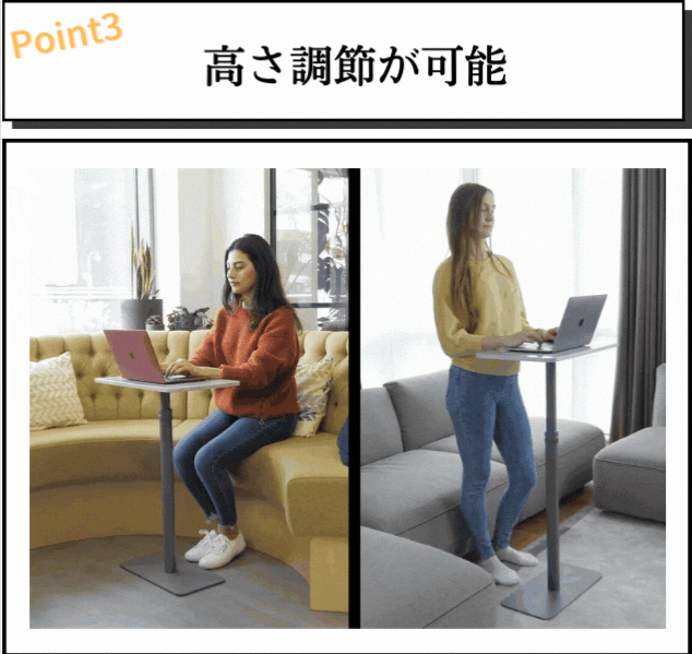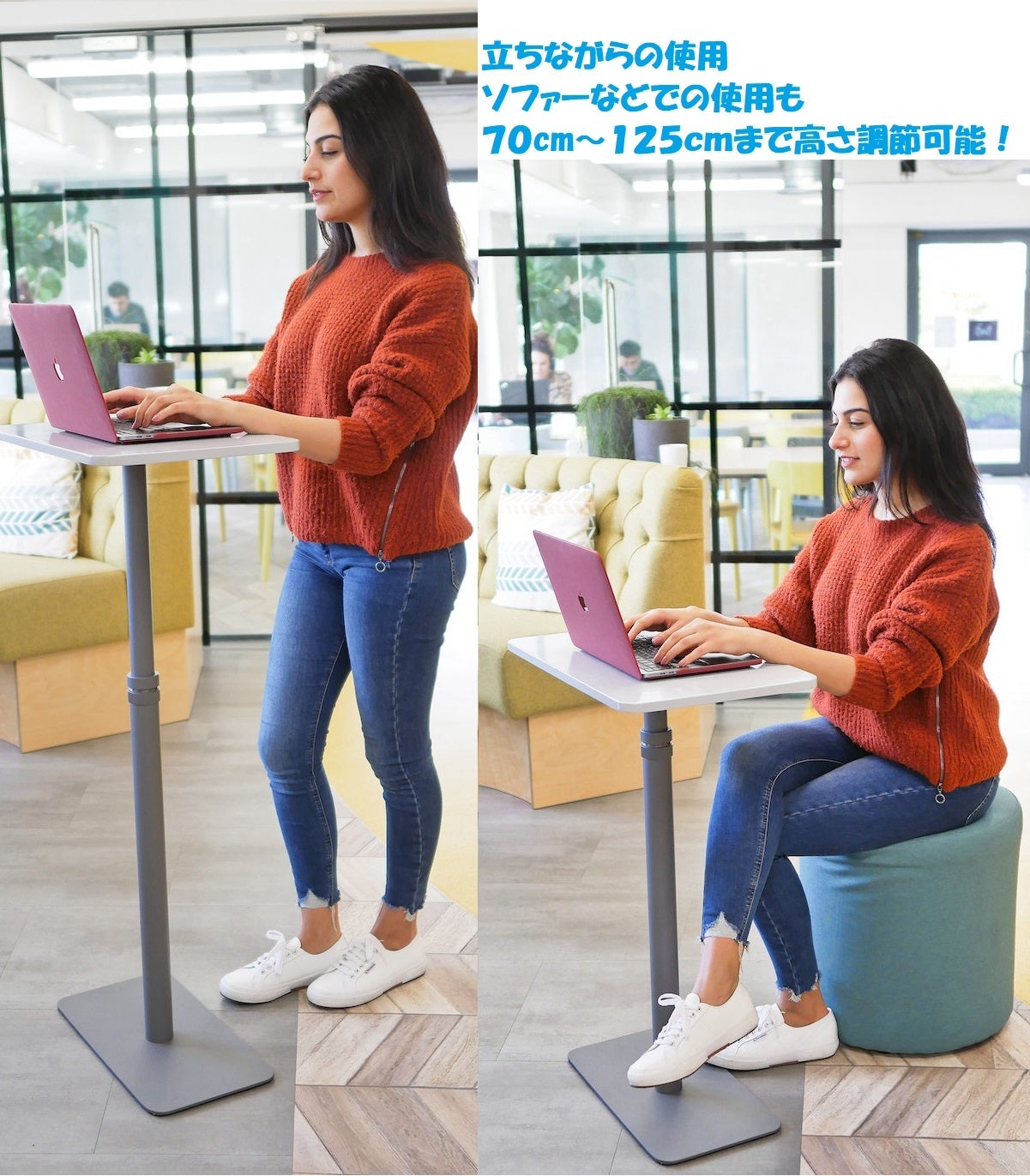 シンプルなデザインで他の家具の雰囲気を壊しません。また、昇降式なので立ちながら作業したり、ソファーなどで作業する事も可能です。