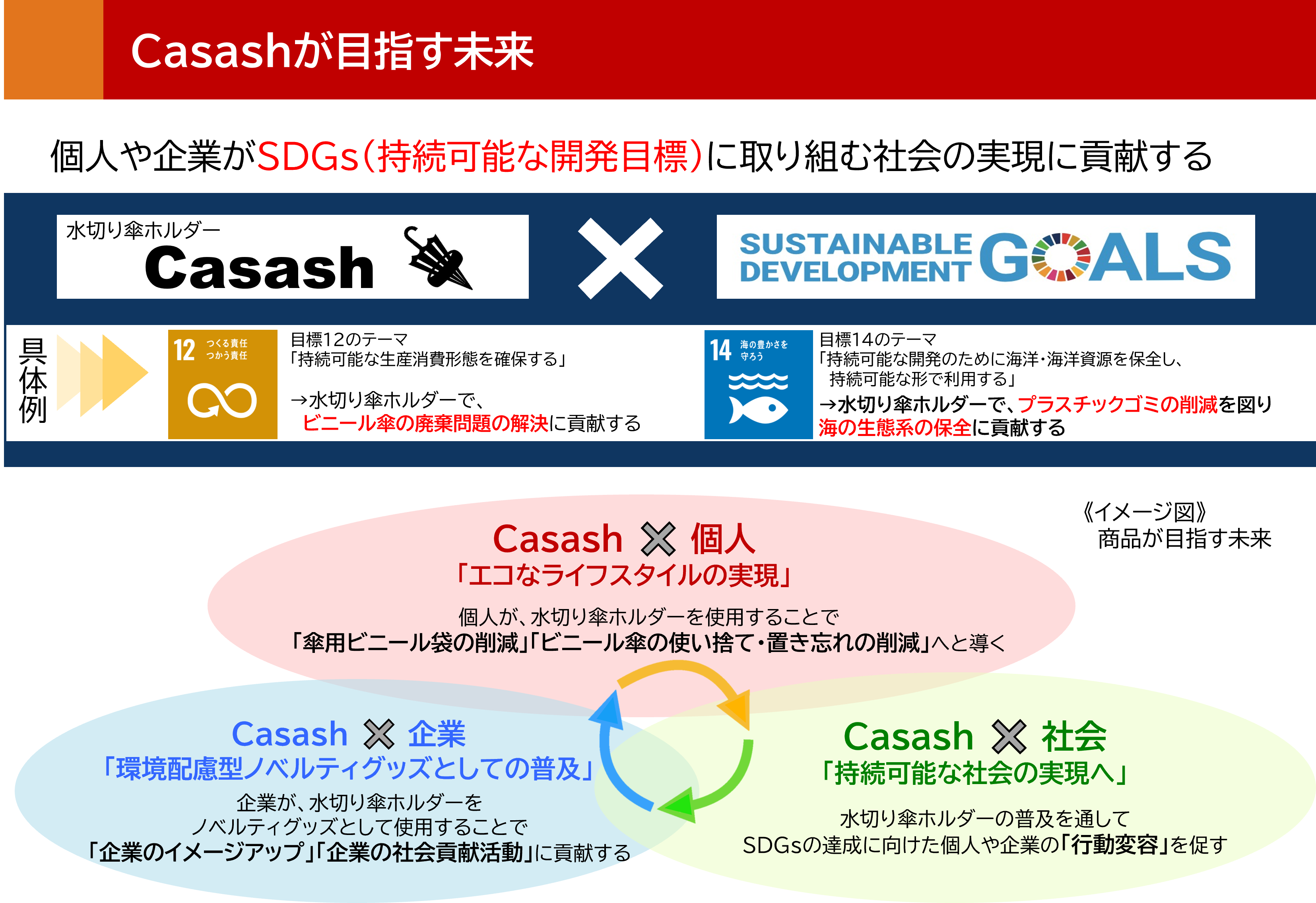 Casashを使用する事で、環境問題や傘の危険な持ち方の社会問題、SDGsの達成に貢献します。