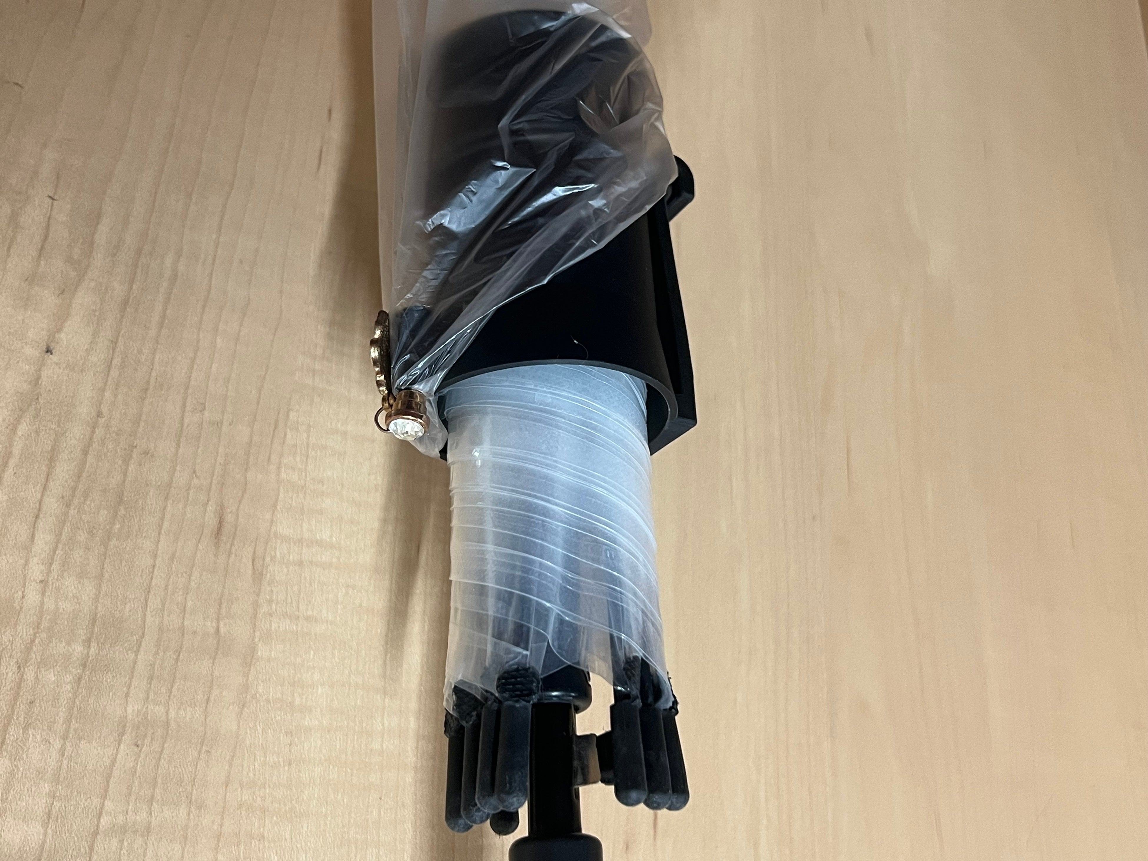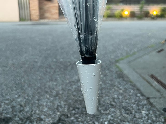 Casashの付属品「石突キャップ」を使うと、ビニール傘の先端に水滴が溜まります。