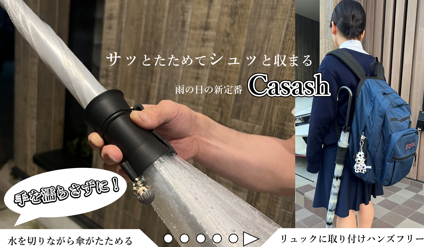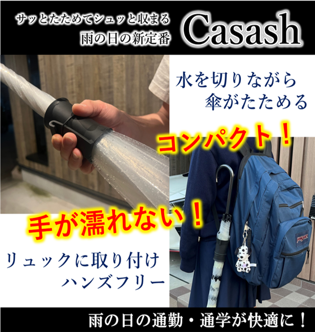 Casashは、濡れた傘を「たたむ時」「持ち歩く時」の不快感を解消し、雨の日の外出を快適にする商品です。