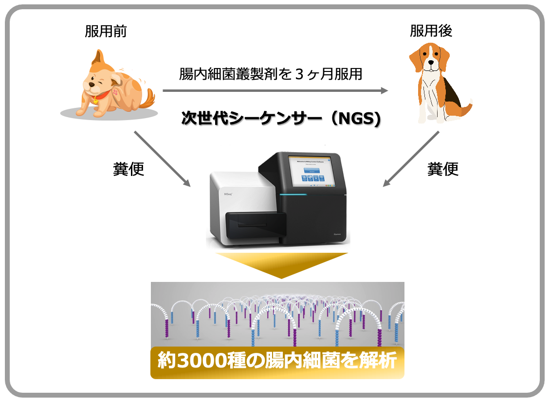 そこで本プロジェクトでは、「皮膚病に罹患しており、腸内細菌製剤を服用している」犬約30頭の糞便を次世代シーケンサー(NGS)を用いて解析し、皮膚と腸内細菌叢の関係性の解明に挑戦します。