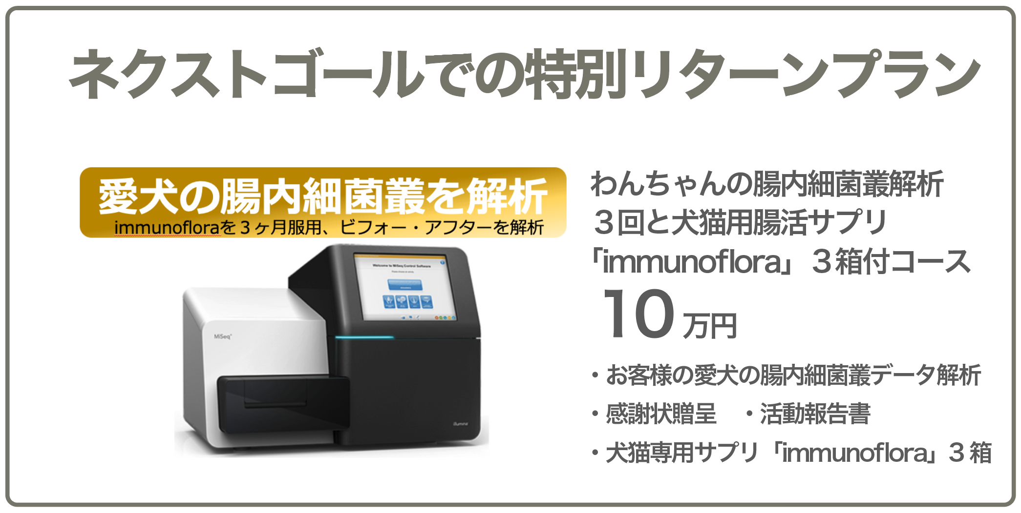犬猫用腸活サプリ「immunoflora」を服用した愛犬の腸内細菌叢がどのように変化するか次世代シーケンサで解析するリターンを新たにご用意しました。