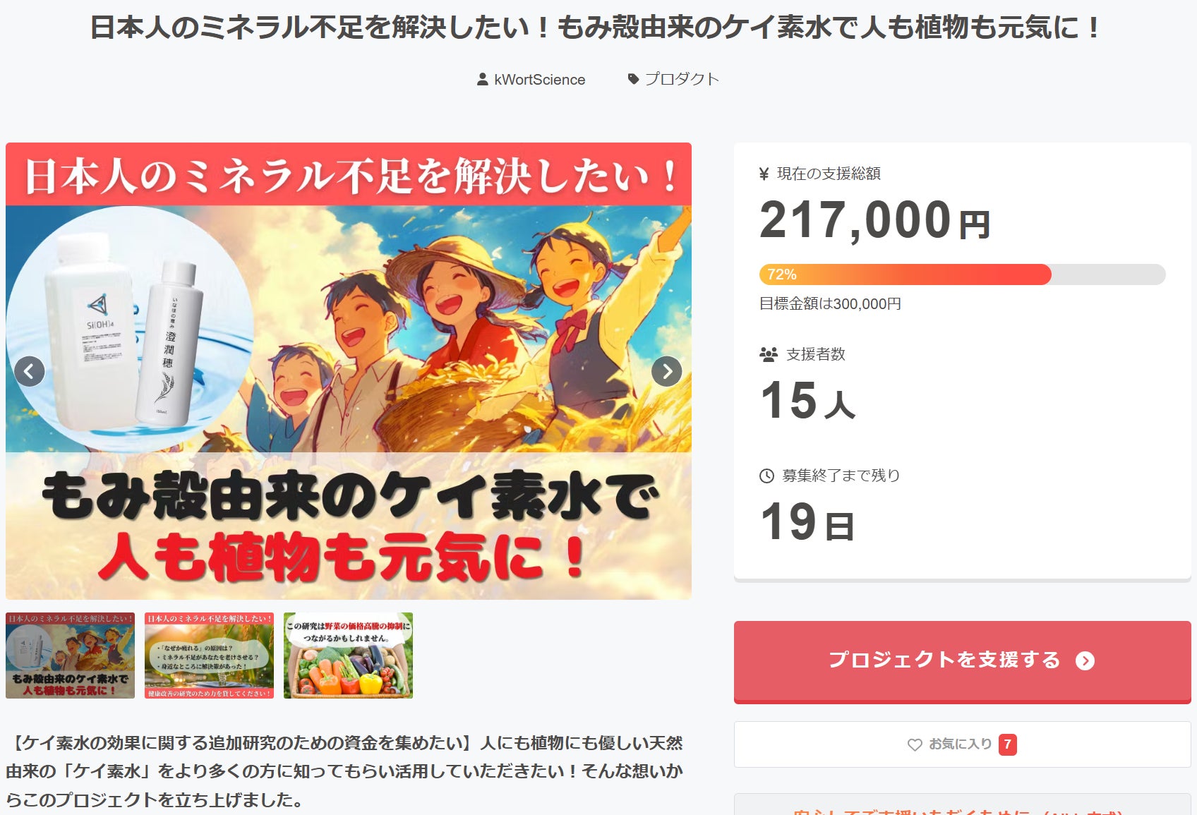 プロジェクト名:日本人のミネラル不足を解決したい!もみ殻由来のケイ素水で人も植物も元気に!