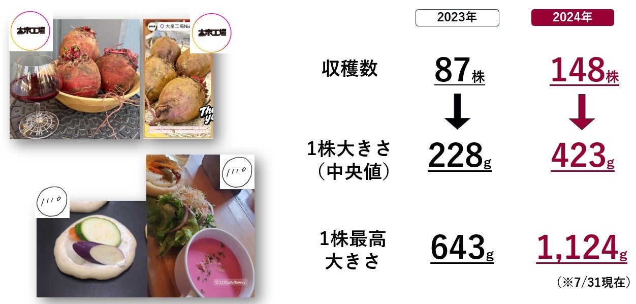 埼玉県の大泉工場さんで直営店舗1110 CAFE/BAKERYへ供給する≪野菜の質と収穫量≫を上げるために、もみ殻ケイ素水もいろいろ試している資材の中のひとつですが、これまで育ちにくかったビーツの栽培がうまくいった一助になっているかもしれません」と使用感を語ってくれました。