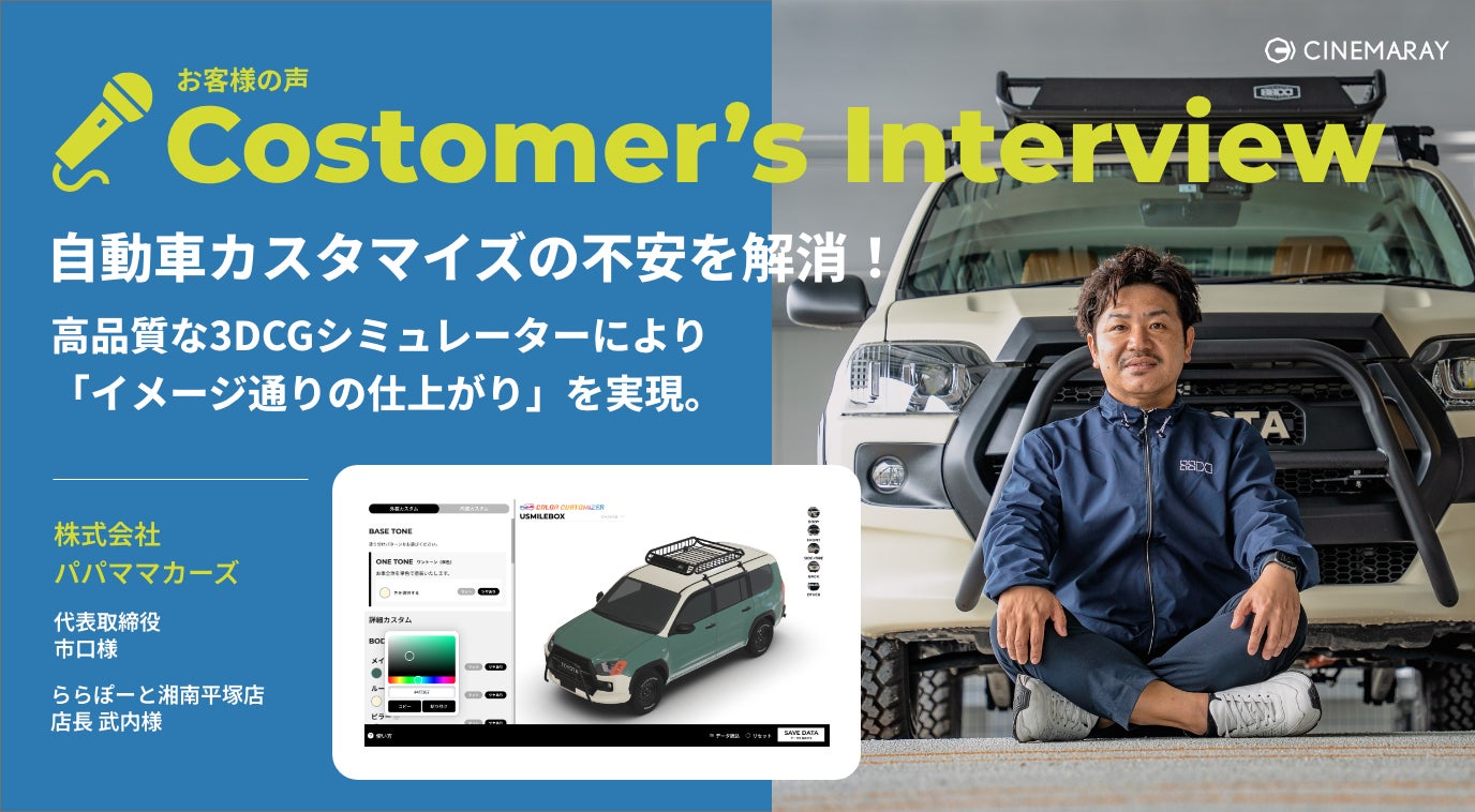 株式会社シネマレイ(本社:名古屋市中区、代表取締役:清水卓、以下シネマレイ)は、2023年4月より株式会社パパママカーズ(代表取締役:市口 慎太朗、以下パパママカーズ)に自由な自動車カスタムをWeb上で体験できるコンフィグレーター「COLOR CUSTOMIZER」をご提供しております。