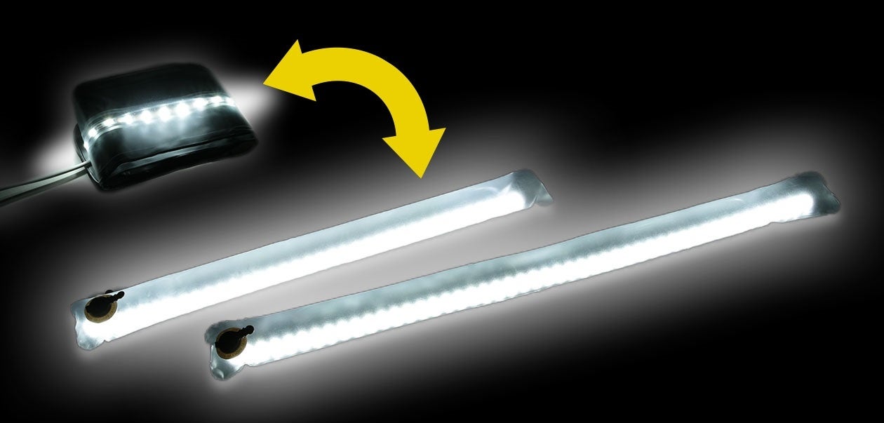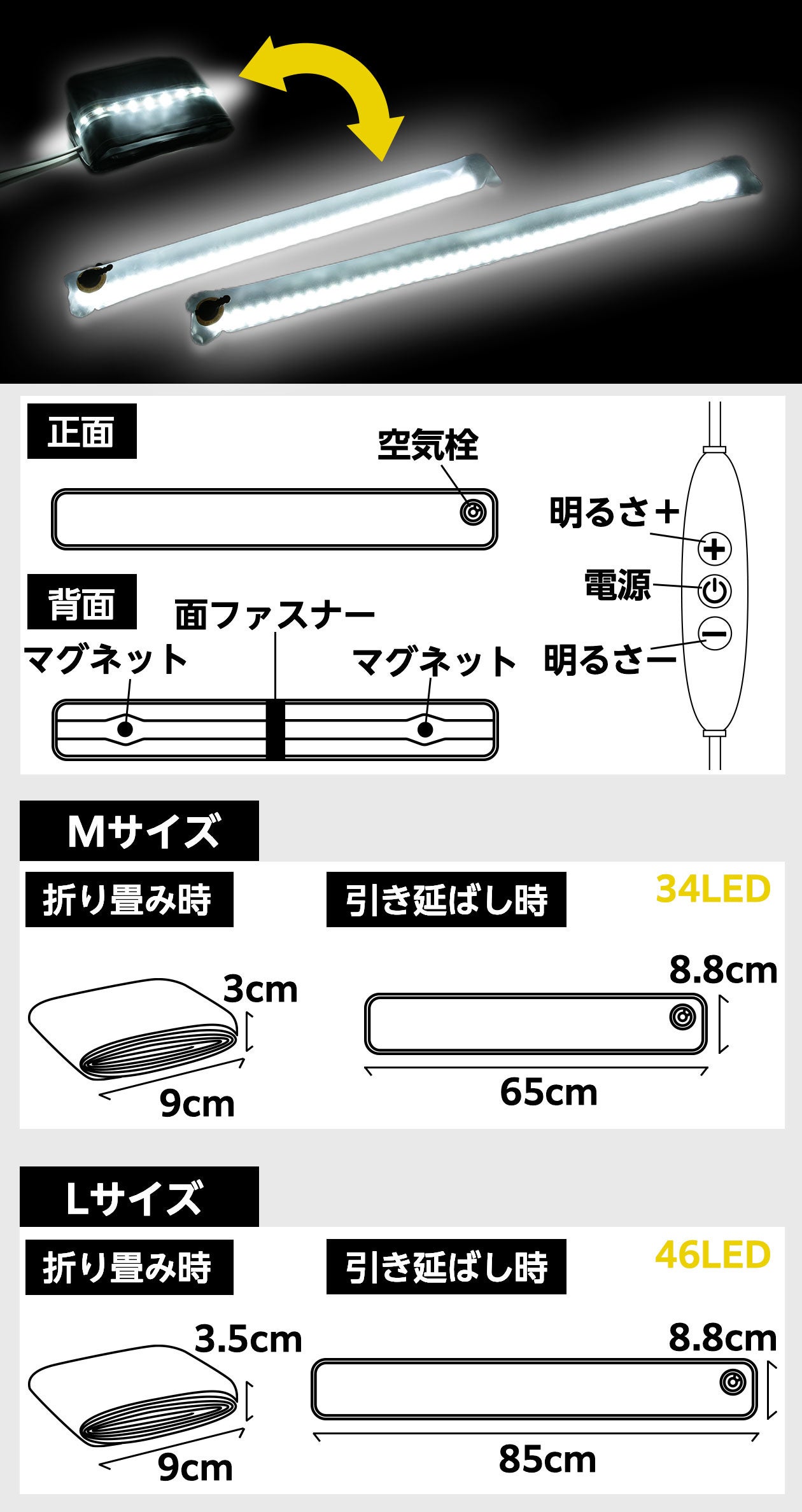 空気を入れて膨らませ、モバイルバッテリーなどにUSB接続するだけで、非常に明るい照明になります。