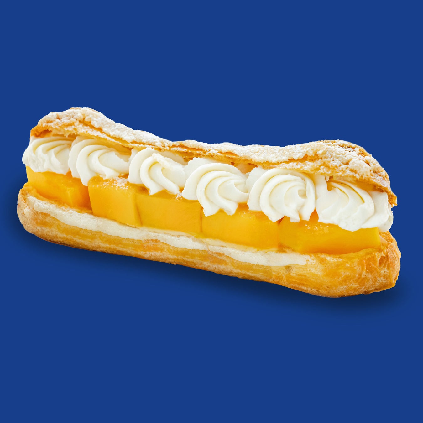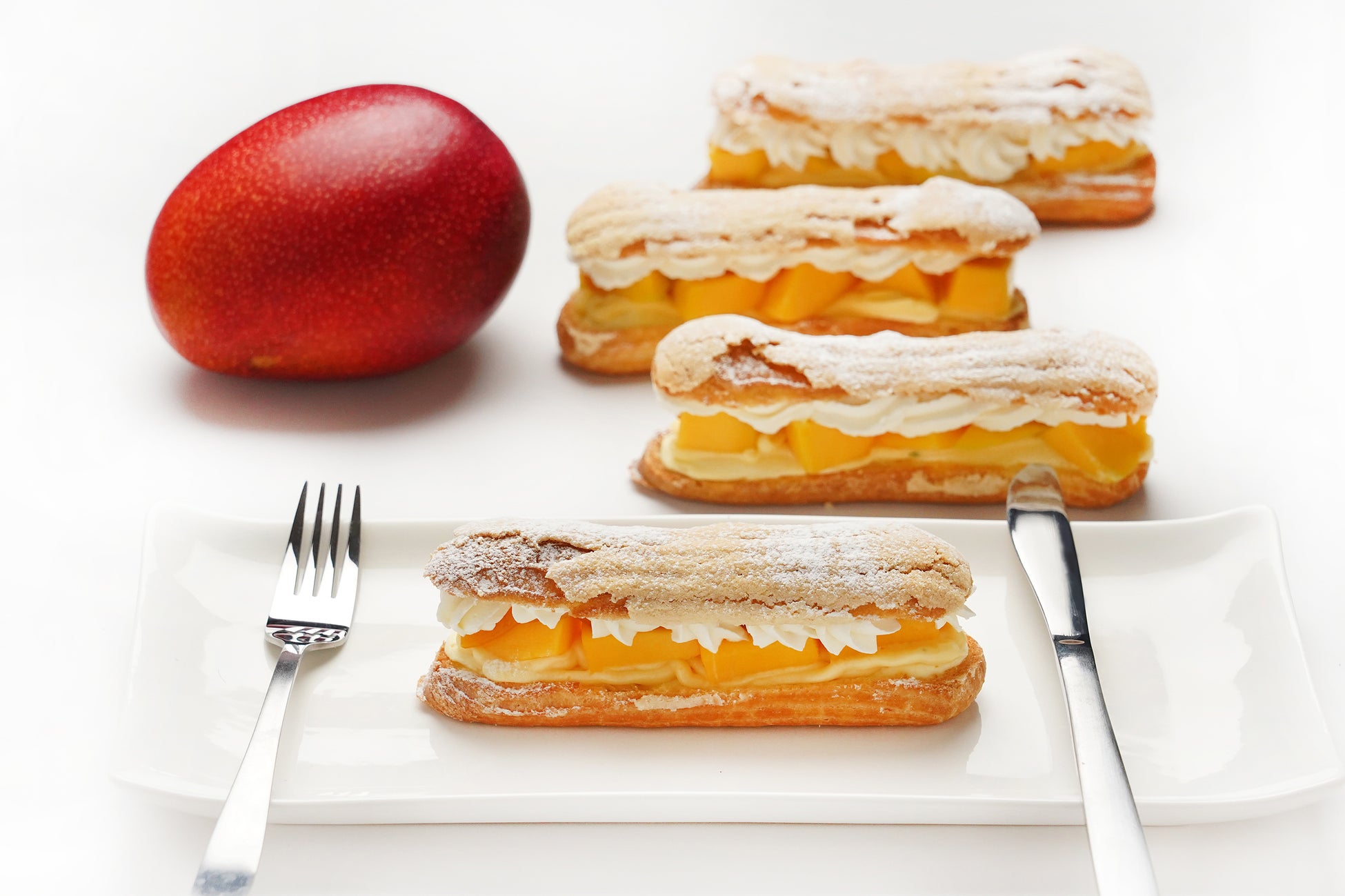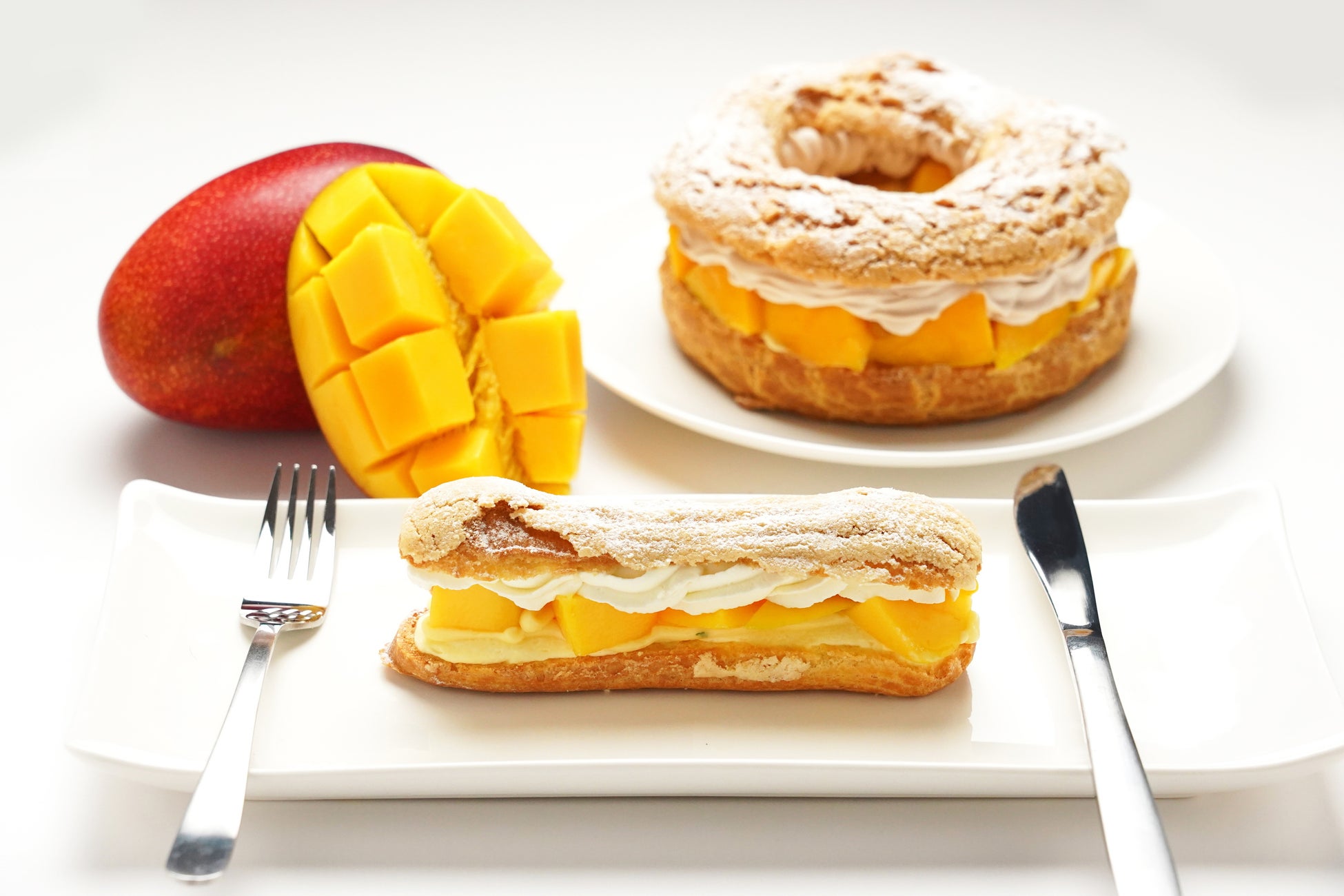 どこからかじっても頬ばれるように、樹上完熟させた沖縄産マンゴーをたっぷり並べたケーキのようなエクレア。アクセントに合わせたのは、沖縄名産の柑橘・シークワーサー。シークワーサーの果汁とクリームを添えてマンゴーをサンドしました。ずっしり大きなケーキ エクレアに仕上げた沖縄の恵みを存分にご堪能ください。
