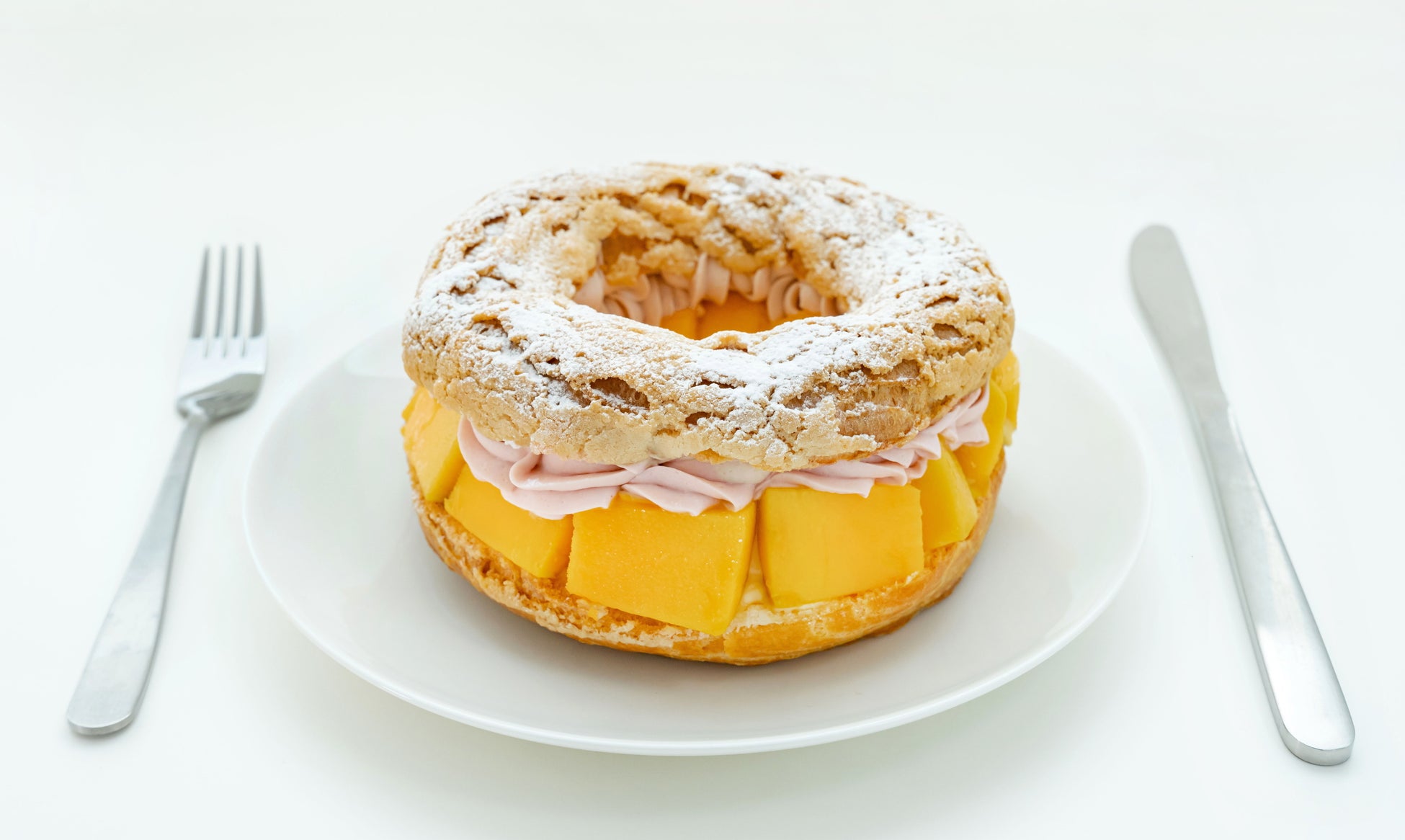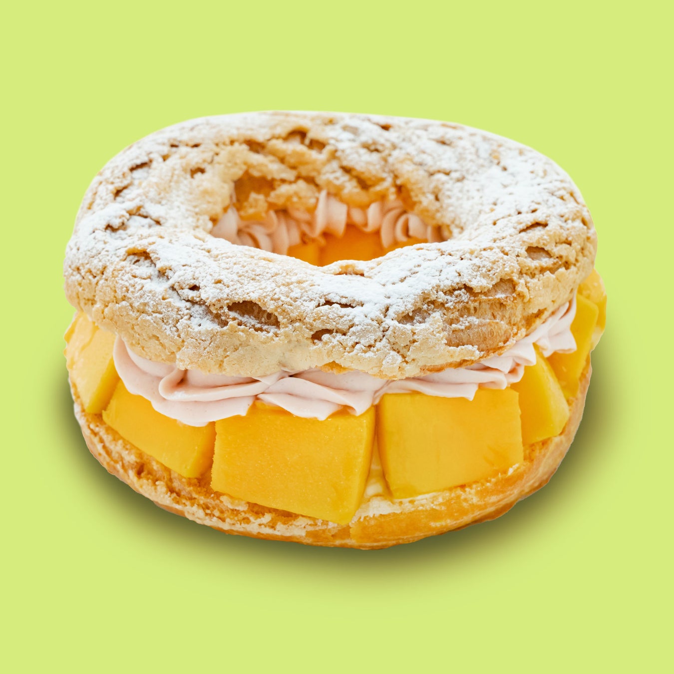 樹上完熟させたマンゴーを贅沢に並べたパリブレスト。マンゴーソースとカスタードの他に、上質なルビーチョコレートクリームを使用しました。沖縄名産の柑橘・シークワーサーの果皮を加えたクリームと果汁は沖縄を感じるアクセント。華やかなルックスと味わいは、夏のパーティーやお祝い事、手土産などにも最適です。