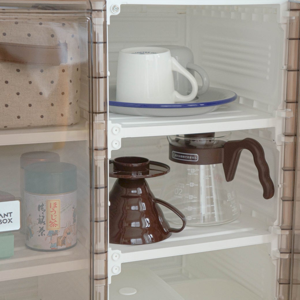 【工具不要・組み立て約5分】雑貨や衣類はもちろん、長靴やブーツも曲げずに収納できる!広くてコンパクトな収納棚です。ドアはホコリを防ぎつつ中身が確認できる茶透明仕様♪