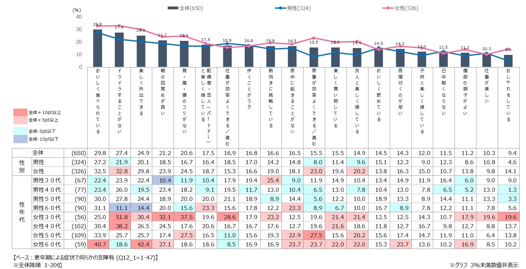つらくなり、効率が落ちる、すぐ疲れる・・・一方で、更年期症状が楽に感じられるのは、おいしく食べられる時、イライラすることがない時、楽しく外出できる時