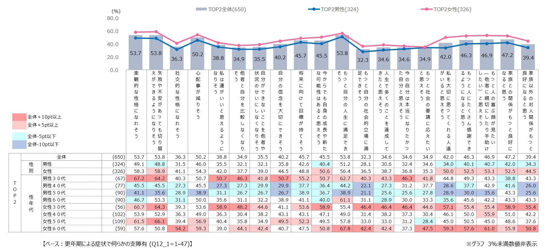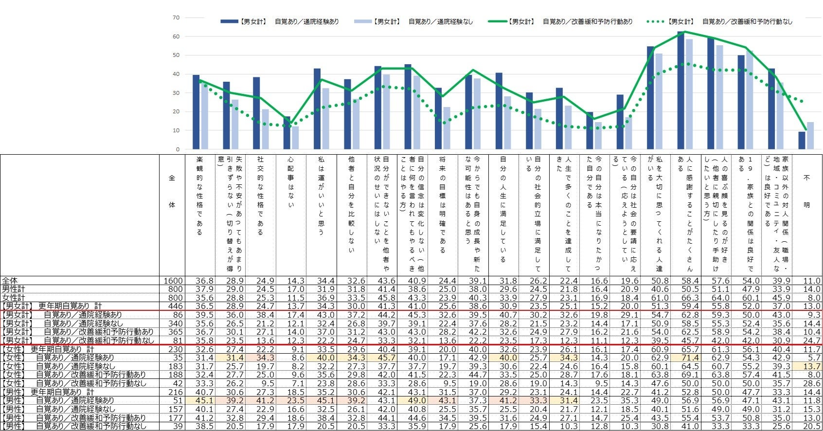 これは、「こうしてみたらしたら、どう?」「専門医にいってみては?」と言ってくれる友人やパートナー、かかりつけ医が周りにいたり、それを自身で決めたり、アクションを起こしたことにより「解決策を見出している」ことで、気持ちを前向きに変化させている結果と見受けられます。次の一歩へのアクションで「更年期」を「幸年期」にかえる力が備わったと思われます。