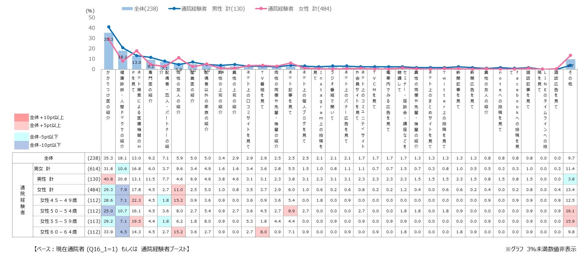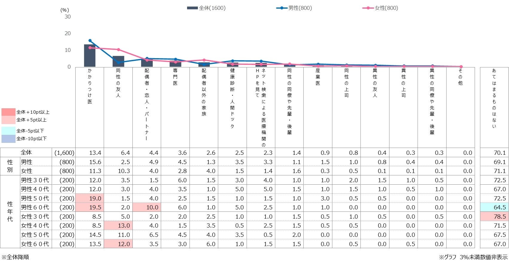一方で、女性は「かかりつけ医の紹介」に次いで、「ネット検索」や、「同性の友人」がきっかけと,「かかりつけ医の紹介」が後押しになっているのが特長的。