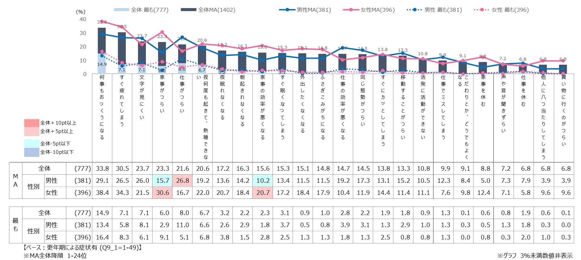 更年期症状によって普段の生活で支障があることで、1位が「億劫になる」こと。次いで、男性は「仕事が辛い」「すぐ疲れる」「文字が見にくい」「夜、何度も起きて熟睡できない」「仕事の効率が悪くなる」「同じ態勢がつらい」など。女性は「すぐ疲れる」「家事ができないなど」「夜、何度も起きて熟睡できない」「文字が見にくい」「夜眠れなくなる」「家事の効率が悪くなる」など。いずれも普段当たり前にできていたことがつらかったり、効率が悪くなるなどの支障が起きている。